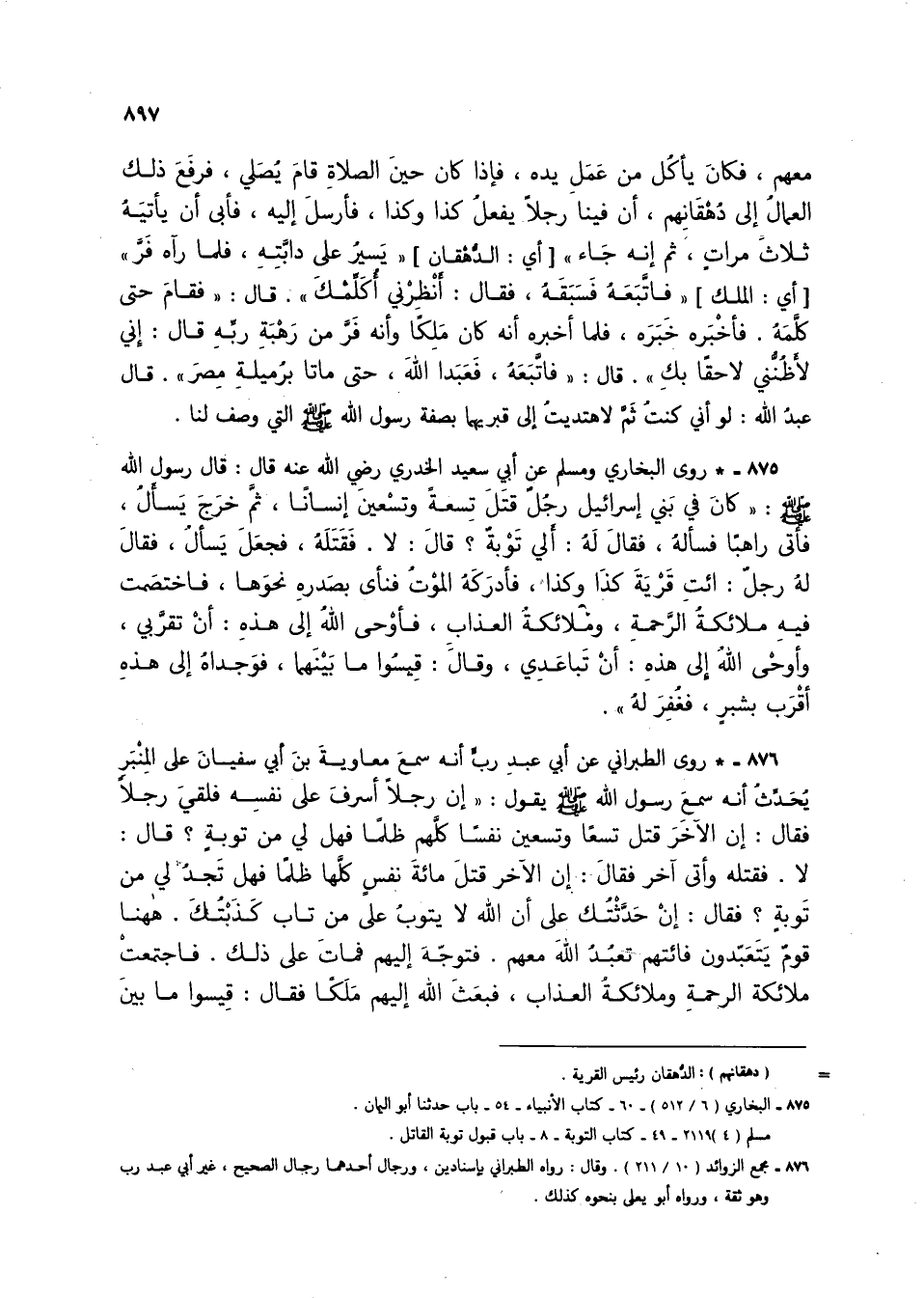 875 - * روى البخاري ومسلم عن أبي سعيد الخدري رضي الله عنه قال: قال رسول الله صلى الله عليه وسلم: "كان في بني إسرائيل رجل قتل تسعة وتسعين إنساناً، ثم خرج يسأل، فأتى راهباً فسأله، فقال له: ألي توبة؟ قال: لا. فقتله، فجعل يسأل، فقال له رجل: ائت قرية كذا وكذا، فأدركه الموت فنأى بصدره نحوها، فاختصمت فيه ملائكة الرحمة، وملائكة العذاب، فأوحى الله إلى هذه: أن تقربي، وأوحى الله إلى هذه: أن تباعدي، وقال: قيسوا ما بينهما، فوجداه إلى هذه أقرب بشبر، فغفر له".