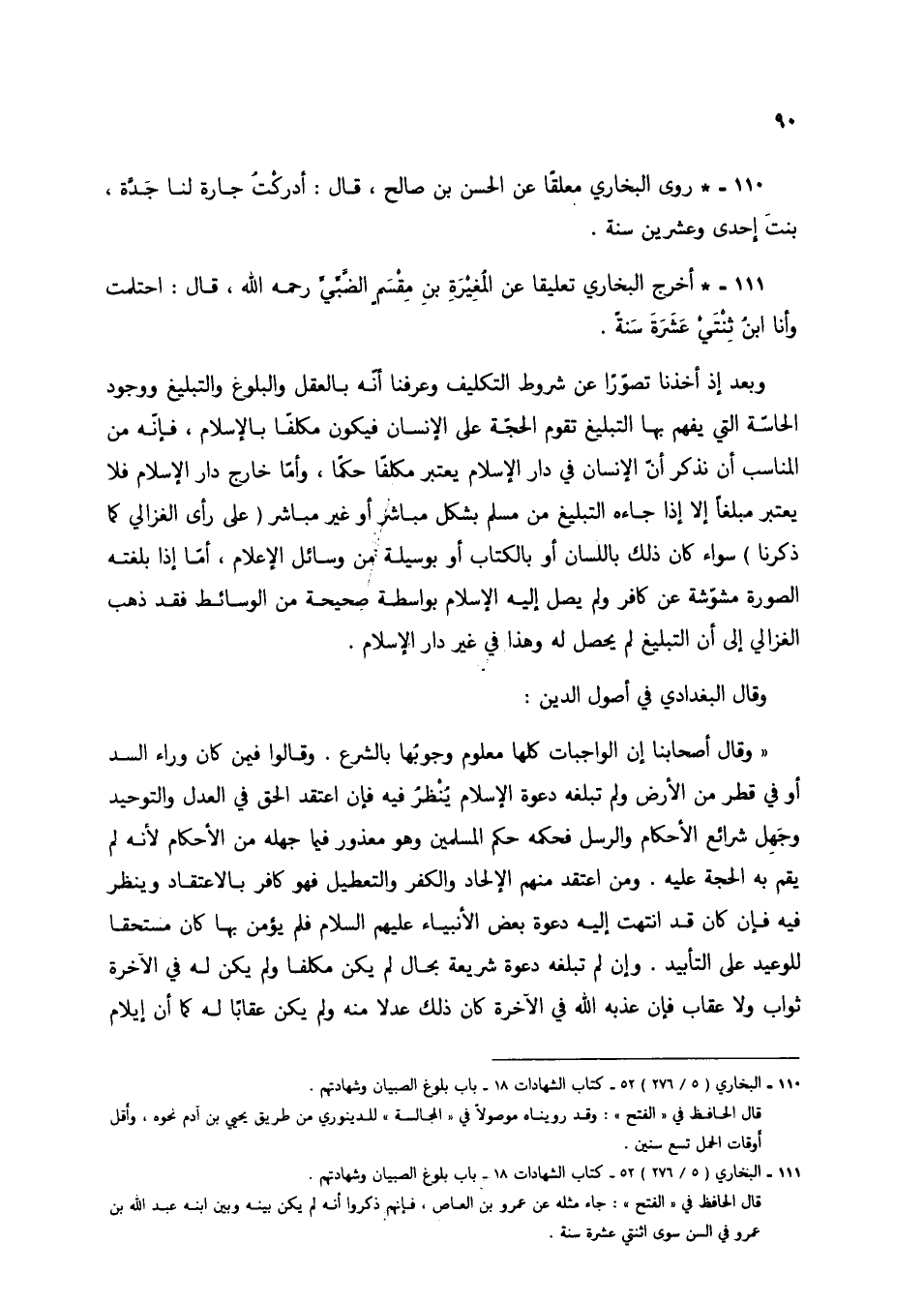 111 - * أخرج البخاري تعليقا عن المغيرة بن مقسم الضبي رحمه الله، قال: احتلمت وأنا ابن ثنتي عشرة سنة.
