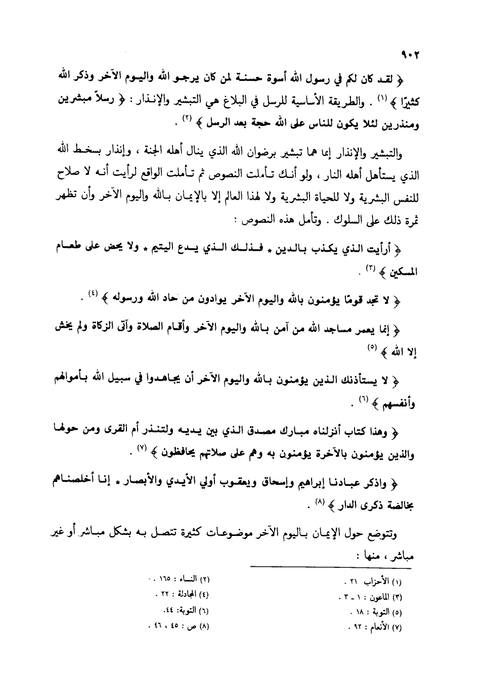 والتبشير والإنذار إنما هما تبشير برضوان الله الذي ينال أهله الجنة، وإنذار بسخط الله الذي يستأهل أهله النار، ولو أنك تأملت النصوص ثم تأملت الواقع لرأيت أنه لا صلاح للنفس البشرية ولا للحياة البشرية ولا لهذا العالم إلا بالإيمان واليوم الآخر وأن تظهر ثمرة ذلك على السلوك. وتأمل هذه النصوص: