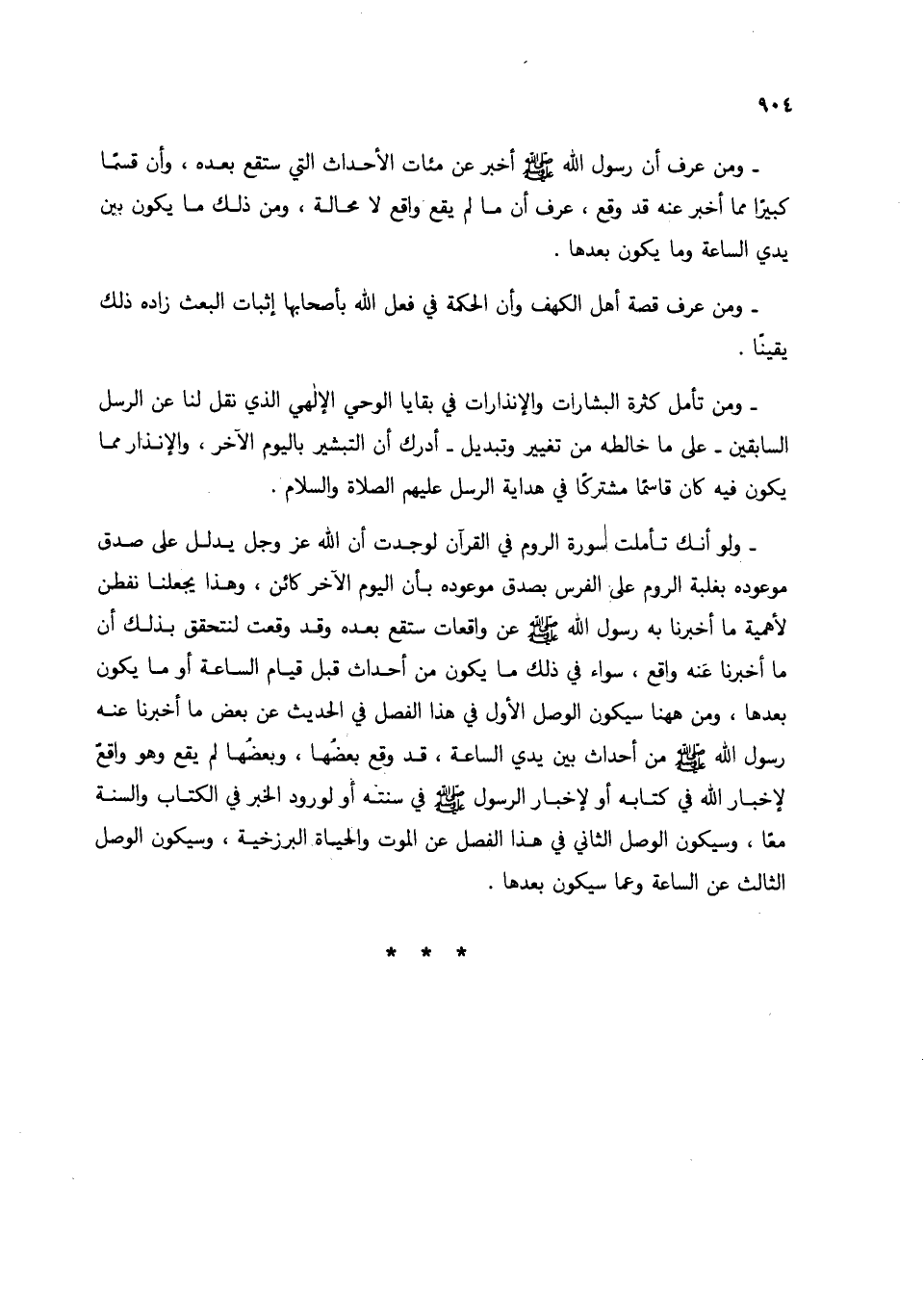 - ولو أنك تأملت سورة الروم في القرآن لوجدت أن الله عز وجل يدلل على صدق موعوده بغلبة الروم على الفرس بصدق موعوده بأن اليوم الآخر كائن، وهذا يجعلنا نفطن لأهمية ما أخبرنا به رسول الله صلى الله عليه وسلم عن واقعات ستقع بعده وقد وقعت لنتحقق بذلك أن ما أخبرنا عنه واقع، سواء في ذلك ما يكون من أحداث قبل قيام الساعة أو ما يكون بعدها، ومن ههنا سيكون الوصل الأول في هذا الفصل في الحديث عن بعض ما أخبرنا عنه رسول الله صلى الله عليه وسلم كم أحداث بين يدي الساعة، قد وقع بعضها، وبعضها لم يقع وهو واقع لإخبار الله في كتابه أو لإخبار الرسول صلى الله عليه وسلم في سنته أو لورود الخبر في الكتاب والسنة معاص، وسيكون الوصل الثاني في هذا الفصل عن الموت والحياة البرزخية، وسيكون الوصل الثالث عن الساعة وعما سيكون بعدها.