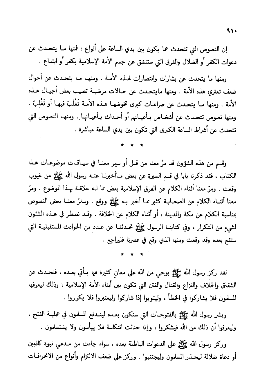 وقسم من هذه الشؤون قد مر معنا من قبل أو سير معنا في سياقات موضوعات هذا الكتاب، فقد ذكرنا بابا في قسم السيرة عن بعض ما أخبرنا عنه رسول الله صلى الله عليه وسلم من غيوب وقعت. ومر معنا أثناء الكلام عن الفرق الإسلامية بعض مما له علاقة بهذا الموضوع. ومر معنا أثناء الكلام عن الصحابة كثير مما أخبر به صلى الله عليه وسلم ووقع. وستمر معنا بعض النصوص بمناسبة الكلام عن مكة والمدينة، أو أثناء الكلام عن الخلافة. وقد نضطر في هذه الشئون لشيء من التكرار، وفي كتابنا الرسول صلى الله عليه وسلم تحدثنا عن عدد من الحوادث المستقبلية التي ستقع بعده وقد وقعت ومنها الذي وقع في عصرنا فليراجع.