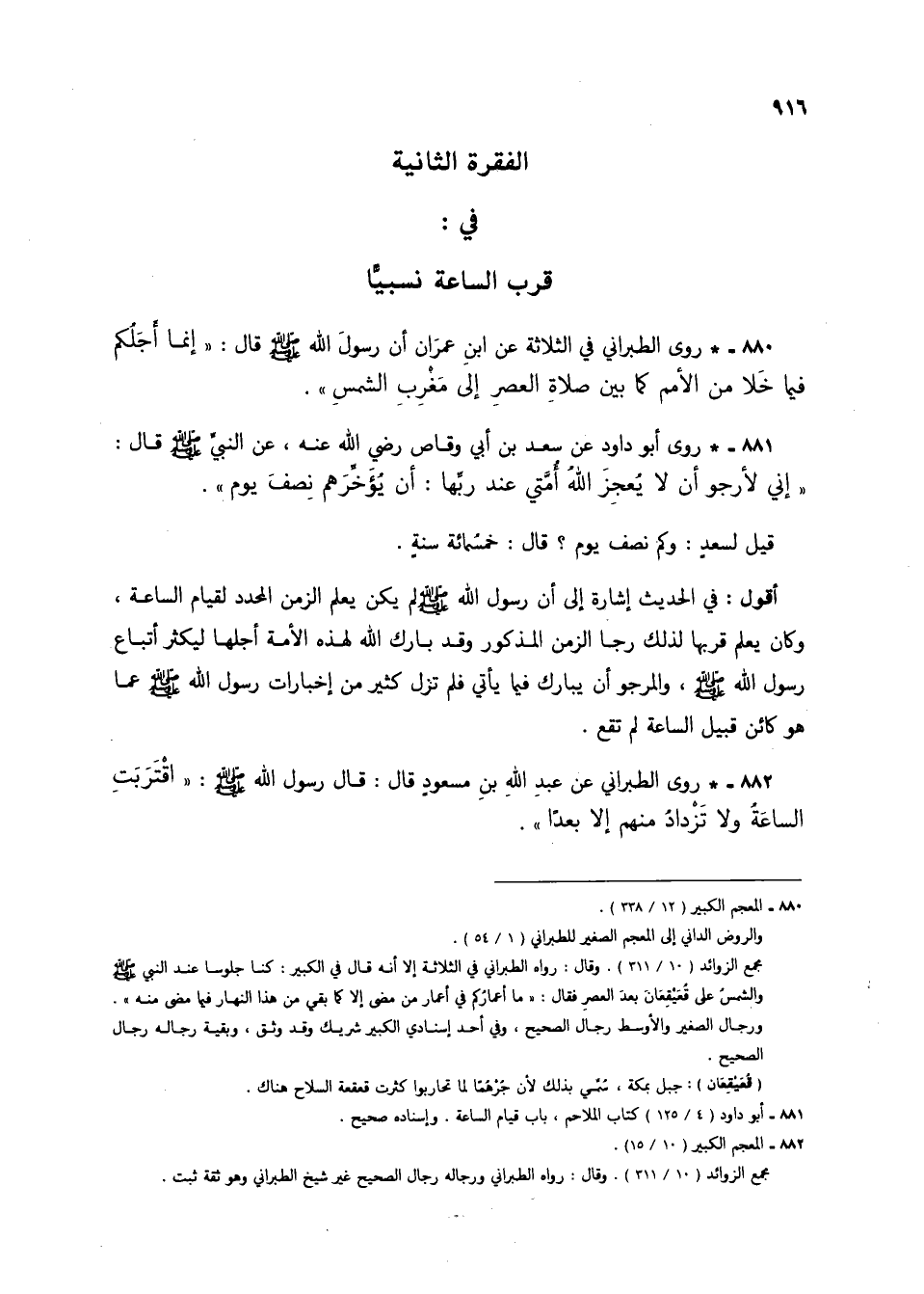 880 - * روى الطبراني في الثلاثة عن ابنِ عمْرَان أن رسول الله صلى الله عليه وسلَّم قال: "إنما أَجَلَكم فيما خَلا من الأمم كما بين صلاةِ العصر إلى مَغْرِبِ الشمسِ"