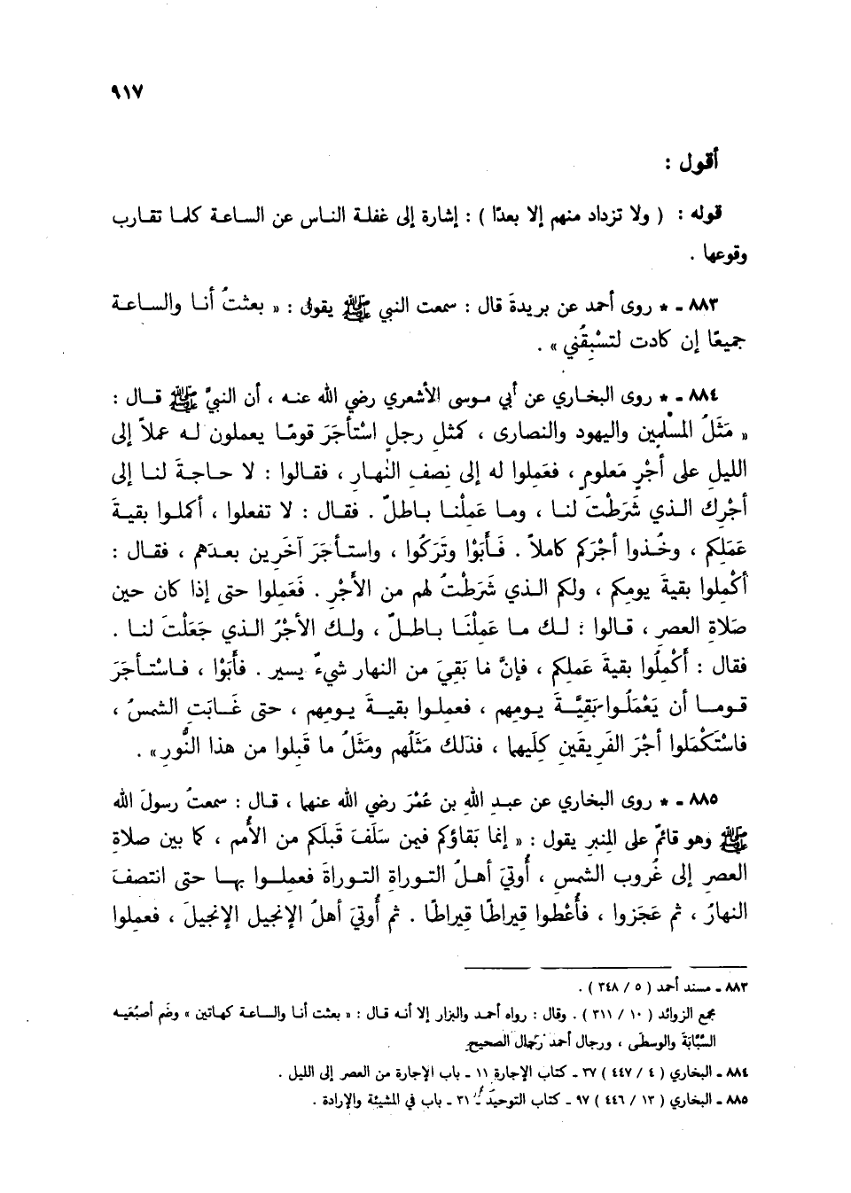 885 - * روى البخاري عن عبدِ اللهِ بن عُمَرَ رضي الله عنهما، قال: سمعتُ رسولَ الله صلى الله عليه وسلَّم وهو قائمٌ على المِنْبَر يقول: "إنما بَقاؤُكم فيمن سَلَفَ قَبلَكم من الأُمم، كما بين صلاة العصر إلى غُرُوب الشمسِ، أُوتِيَ أهلُ التوراةِ التوراةَ فعمِلوا بها حتى انتصفَ النهارُ، ثمَّ عَجَزوا، فأعْطوا قِيراطاً قِيراطاً. ثمَّ أُوتِيَ أهلُ الإنجيل الإنجيلَ، فعمِلوا
