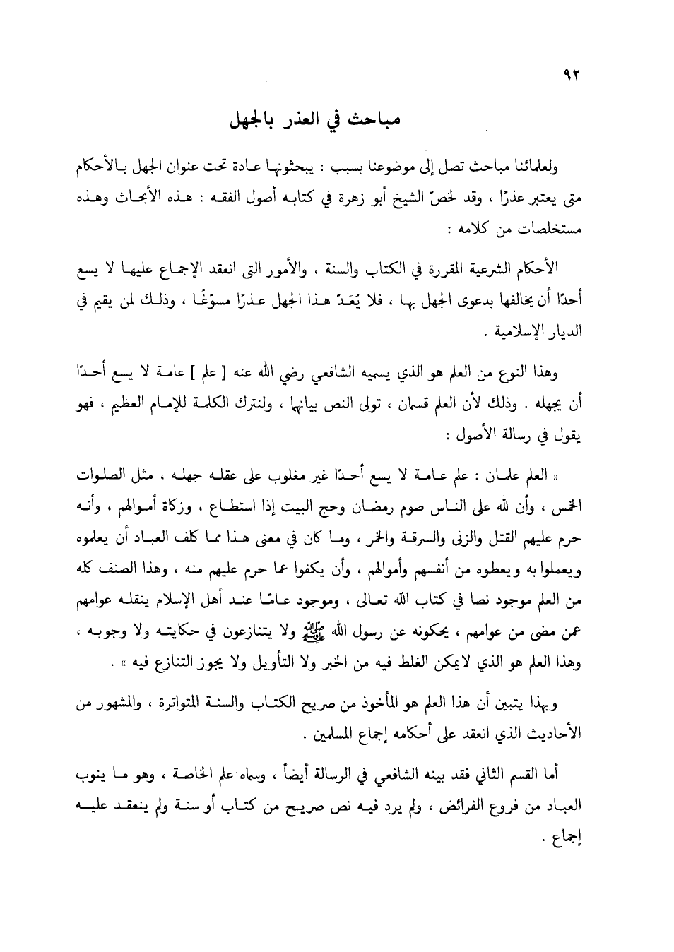 "العلم علمان: علم عامة لا يسع أحداً غير مغلوب على عقله جهله، مثل الصلوات الخمس، وأن لله على الناس صوم رمضان وحج البيت إذا استطاع، وزكاة أموالهم، وأنه حرم عليهم القتل والزنى والسرقة وأموالهم، وأن يكفوا عما حرم عليهم منه، وهذا الصنف كله من العلم موجود نصاً في كتاب الله تعالى، وموجود عاما عند أهل الإسلام ينقله عوامهم عمن مضى من عوامهم، يحكونه عن رسول الله صلى الله عليه وسلم ولا يتنازعون في حكايته ولا وجوبه، وهذا العلم هو الذي لا يمكن الغلط فيه من الخبر ولا التأويل ولا يجوز التنازع فيه".