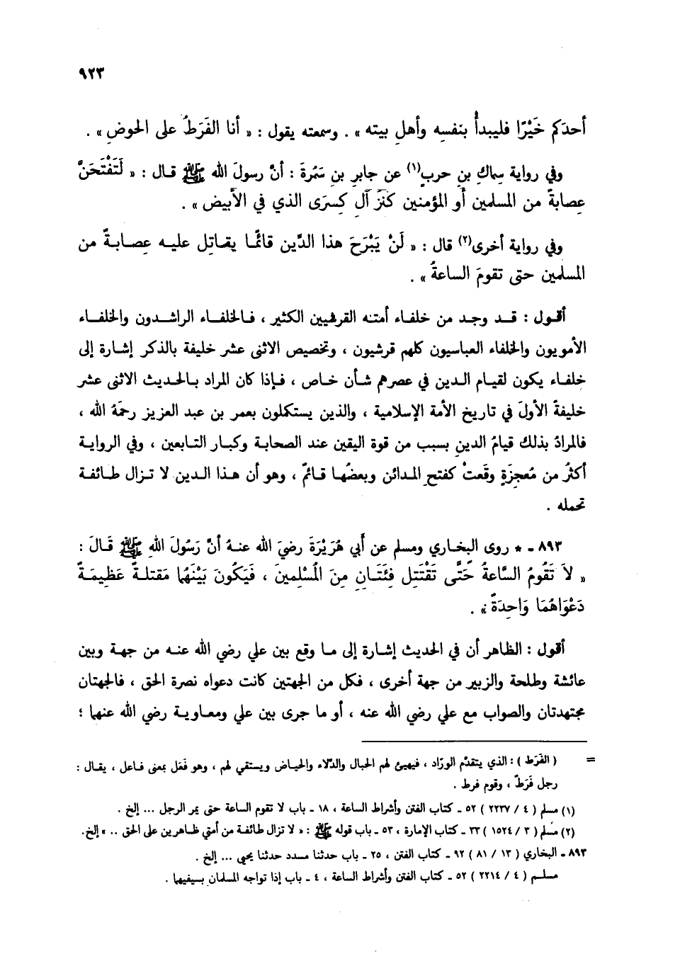 893 - * روى البخاري ومسلم عن أَبي هُرَيرَة رضي الله عنهُ أنَّ رَسُولَ اللهِ صلى الله عليه وسلَّم قال: "لَاتَقُومُ السَّاعةُ حَتَّى تَقْتَتِل فِئَتَانِ مِنَ المُسْلِمِينَ، فَيَكُونَ بَيْنَهُمَا مَقتلَةٌ عَظِيمَةٌ دَعْوَاهُمَا وَاحِدَةٌ".