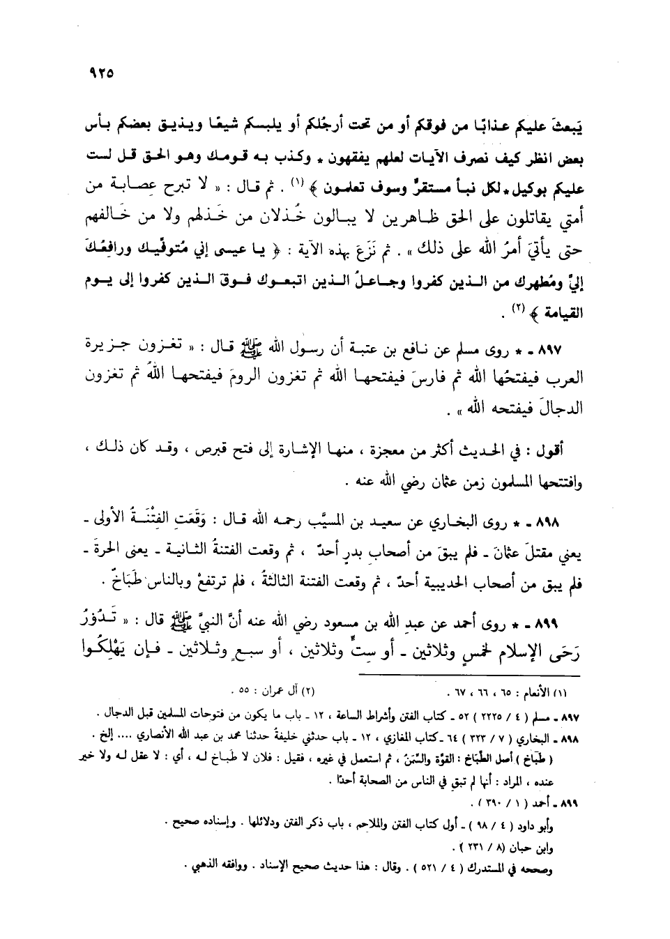 897 - * روى مسلم عن نافع بن عتبة أن رسول الله صلى الله عليه وسلَّم قال: "تغزون جزيرة العرب فيفتحُها الله ثم فارسَ فيفتحها الله ثم تغزون الرومَ فيفتحها اللهُ ثم تغزون الدجالَ فيفتحه الله".