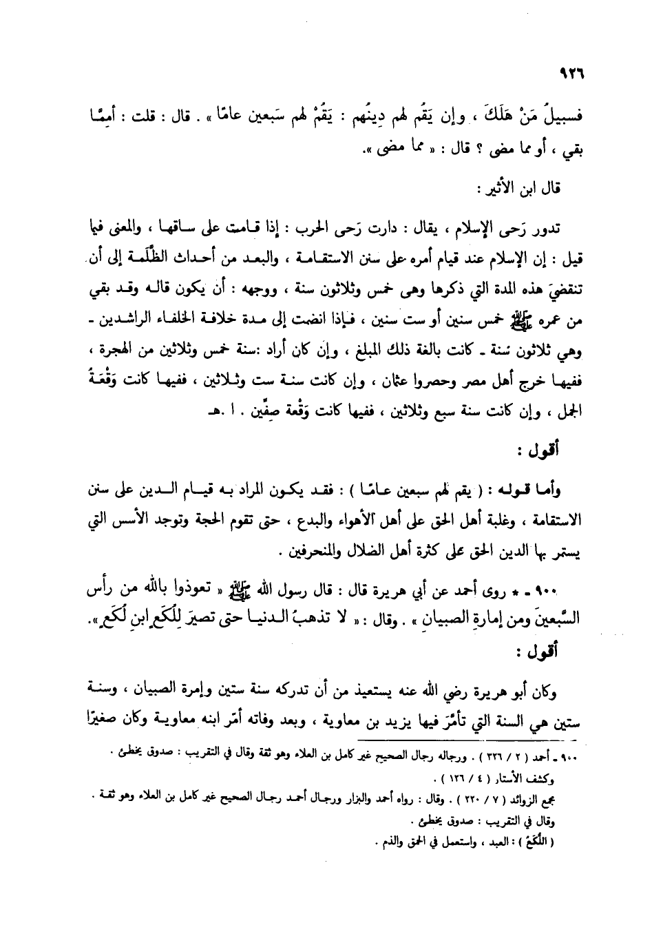 900 - * روى أحمد عن أبي هريرة قال: قال رسول الله صلى الله عليه وسلَّم: "تعوذوا بالله من رأس السَّبعينَ ومن إمارةِ الصبيانِ". وقال: "لا تذهبُ الدنيا حتى تصيرَ لِلُكَعٍ ابنِ لُكَعٍ".