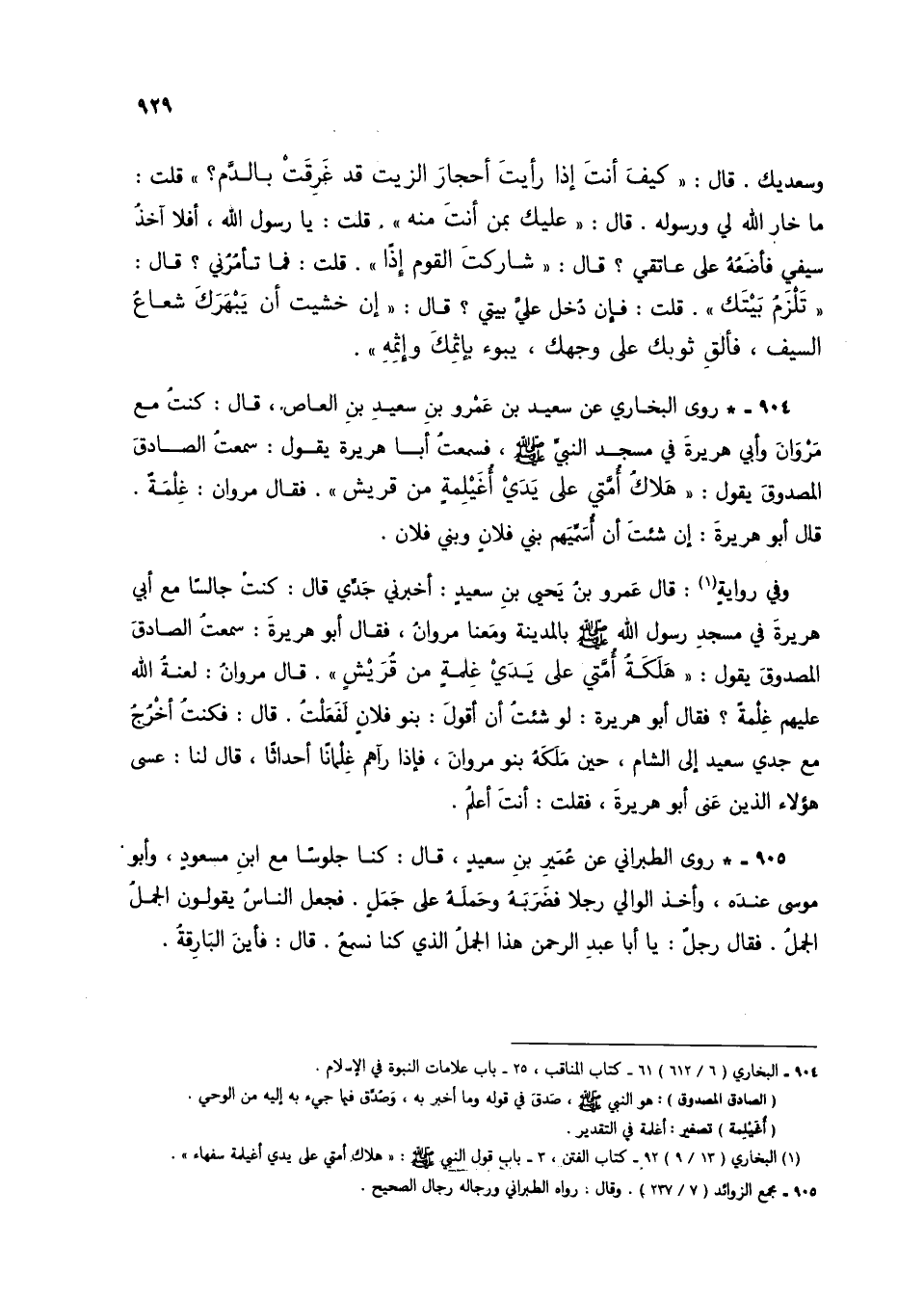 904 - * روى البخاري عن سعيد بن عَمْرو بن سعيد ين العاص، قال: كنتُ مع مَرْوَانَ وأبي هُريرة في مسجد النبي صلى الله عليه وسلَّم، فسمعتُ أبا هُريرة يقول: سمعتُ الصادقَ الصدوقَ يقول: "هَلاكُ أُمَّتي على يَدَي أُغَلْلِمةٍ من قريش". فقال مروان: غِلْمَةٌ. قال أبو هريرة: إن شئت أن أُسَمِّهم بني فلانٍ وبني فلان.
