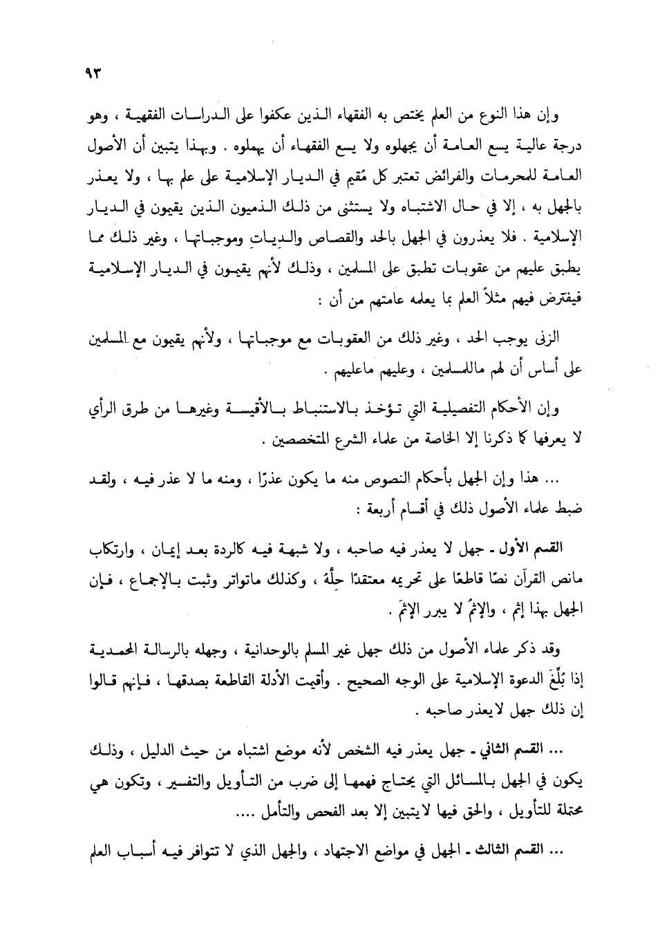 القسم الثاني - جهل يعذر فيه الشخص لأنه موضع اشتباه من حيث الدليل، وذلك يكون في الجهل بالمسائل التي يحتاج فهمها إلى ضرب من التأويل والتفسير، وتكون هي محتملة للتأويل، والحق فيها لا يتبين إلا بعد الفحص والتأمل ....