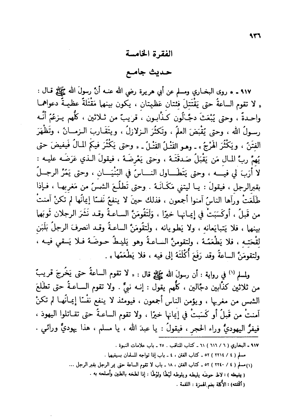 917 - * روى البخاري ومسلم عن أبي هريرة رضي الله عنه أنَّ رسول الله صلى الله عليه وسلَّم قال: "لا تقوم الساعةُ حتى يَقْتَتِل فِئَتَانِ عَظِيمَتَانِ، يكون بينهما مُقْتَلَةٌ عظيمةٌ دعواهما واحدةٌ، وحتى يُبْعَثُ دجَّالون كذَّابون، قريبٌ من ثلاثين، كلُّهم يزعم أنه رسولُ الله، حتى يُقْبَضَ العلمُ، وتكثُرَ الزلازلُ، ويتقاربَ الزمانُ، وتظهرَ الفِتَنُ، ويكثُرَ الهَرْجُ"- وهو القتْلُ القتْلُ- "وحتى يكثُرَ فيكم المالُ فَيَفيضَ حتى يُهِمَّ ربّ المال مَن يقْبَلُ صَدَقَتَه، وحتى يعرضَه، فيقولَ الذي عرَضَه عليه: لا أرَب لي فيه، وحتى يَتَطَاول الناسُ في البُنْيَان، وحتى تَطْلُعَ الشمسُ من مَغْرِبها، فإذا طلعتْ ورآها الناسُ آمنوا أجمعون، فذلك حينَ لا ينفعُ نفساً إِيمانُها لم تكنْ آمنتْ من قَبلُ، أو كسبَت في إيمانها خيراً، ولتقومنَّ الساعةُ وقد نَشَرَ الرجلان ثوبَهما بينهما، فلا يَتَبايَعانه، ولا يَطويانه، ولتقومنَّ الساعةُ وقد انصرفَ الرجلُ بَلبنِ لِقْحَتِهِ، فلا يَطعَمَهُ، ولتقومنَّ الساعةَ وهو يَليطُ حوضَهُ فلا يَسقِي فيه، ولتقومَنَّ الساعةَ وقد رَفَعَ أكلته إلى فِيهِ، فلا يطْعَمْها".