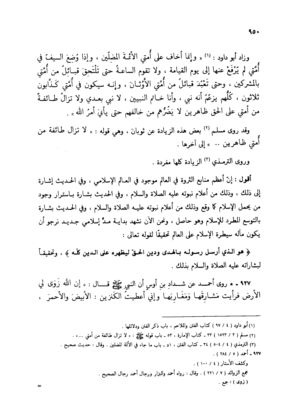 927 - * روى أحمد عن شداد بن أَوسٍ أنّ النبي صلى الله عليه وسلَّم قال: "إنَّ الله زَوَى لي الأرض فرأيت مَشارِقَها ومَغَارِبَها وإني أعطِيتُ الكنزين: الأبيضَ والأحمرَ،
