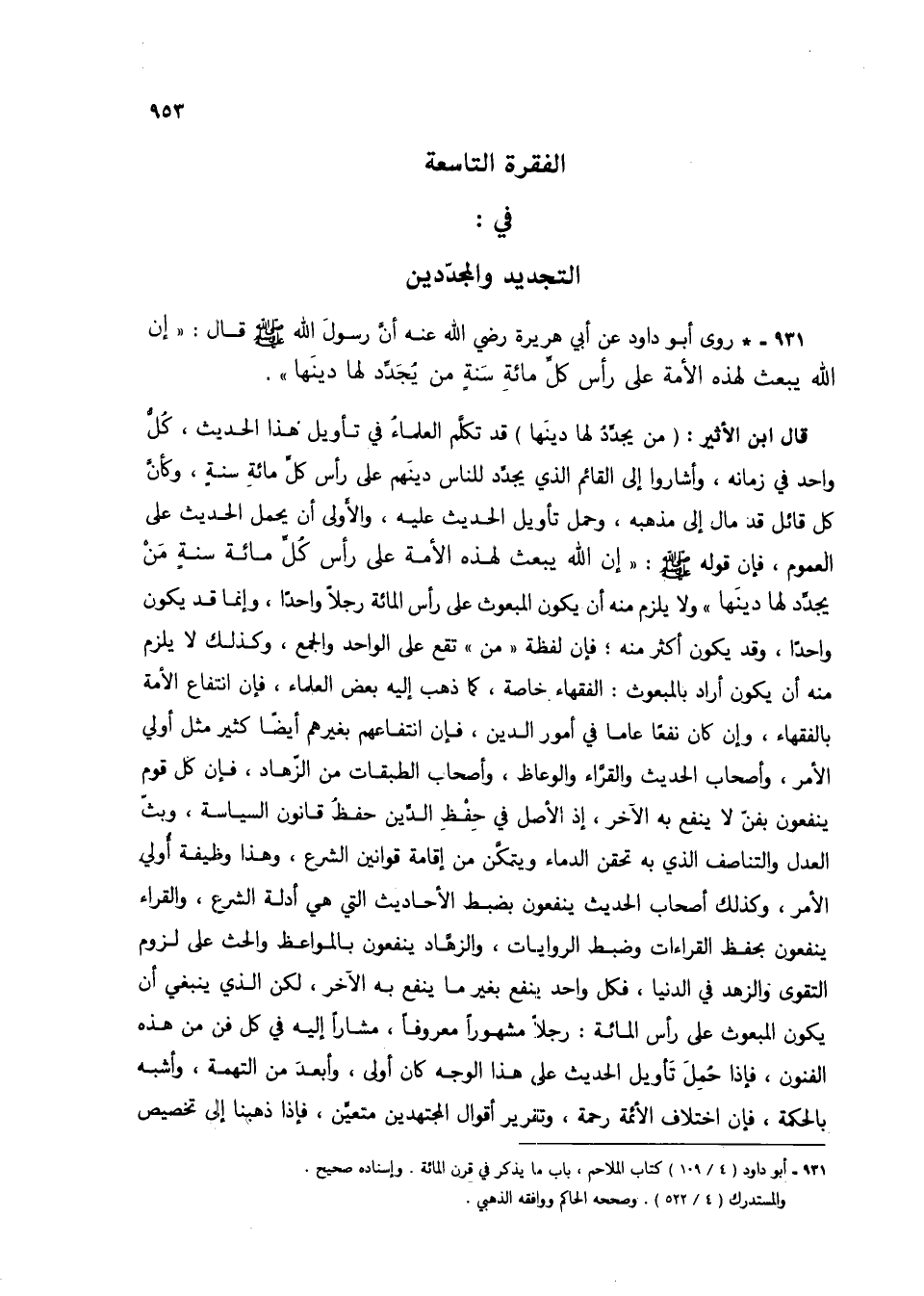 931 - * روى أبو داود عن أبي هريرة رضي الله عنه أن رسول الله صلى الله عليه وسلم قال: "إن الله يبعث لهذه الأمة على رأس كل مائة سنة من يجدد لها دينها".