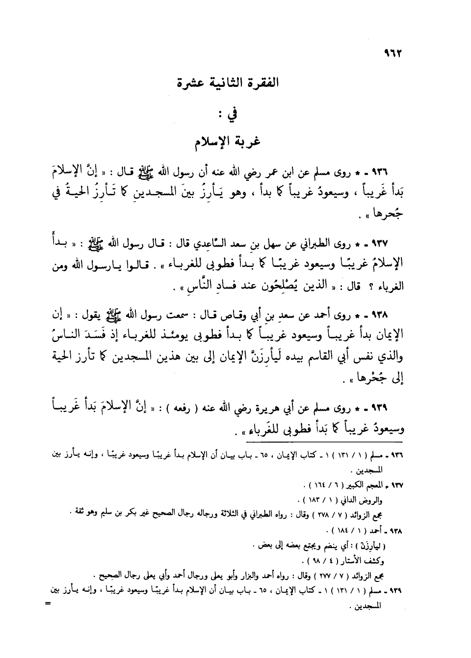 938 - * روى أحمد عن سعد بن أبي وقاص قال: سمعت رسول الله صلى الله عليه وسلم يقول: "إن الإيمان بدأ غريباً وسيعود غريباً كما بدأ فطوبي يومئذ للغرباء إذ فسد الناس والذي نفس أبي القاسم بيده ليأرزن الإيمان إلى بين هذين المسجدين كما تأرز الحية إلى حجرها".