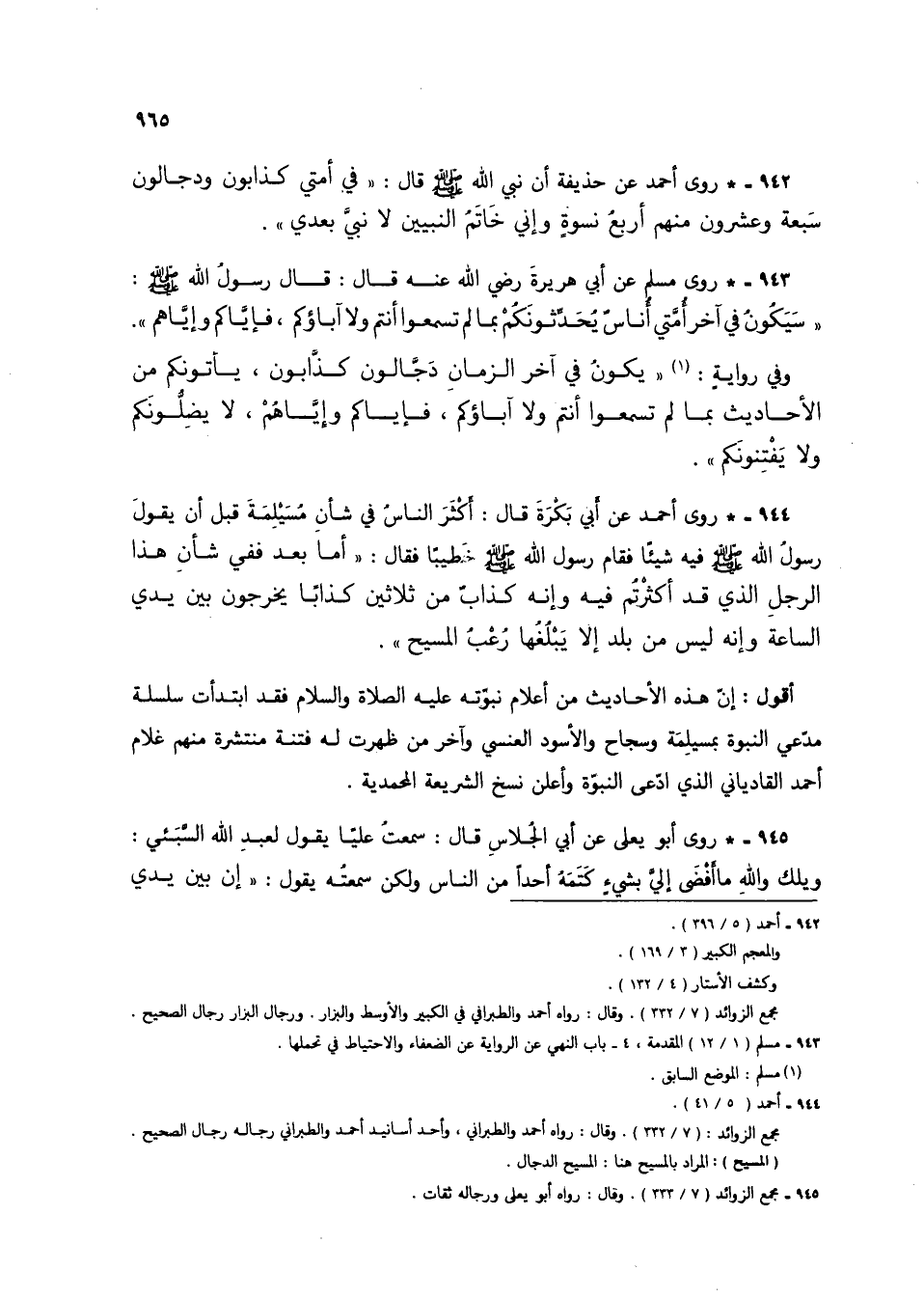 942 - * روى أحمد عن حذيفة أن نبي الله صلى الله عليه وسلم قال: "في أمتي كذابون ودجالون سبعة وعشرون منهم أربع نسوة وإني خاتم النبيين لا نبي بعدي".