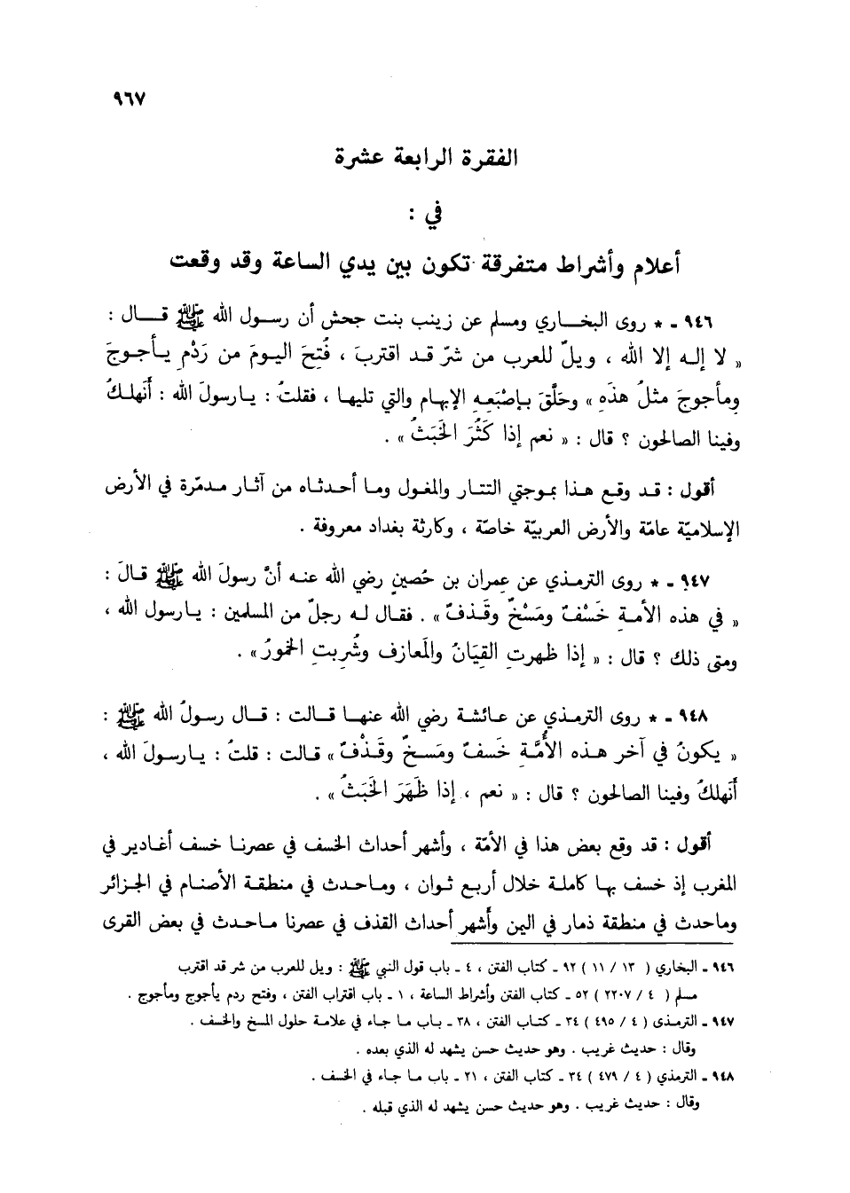 948 - * روى الترمذي عن عائشة رضي الله عنها قالت: قال رسول الله صلى الله عليه وسلم: "يكون في آخر هذه الأمة خسف ومسخ وقذف" قالت: قلت: يا رسول الله، أنهلك وفينا الصالحون؟ قال: "نعم، إذا ظهر الخبث".