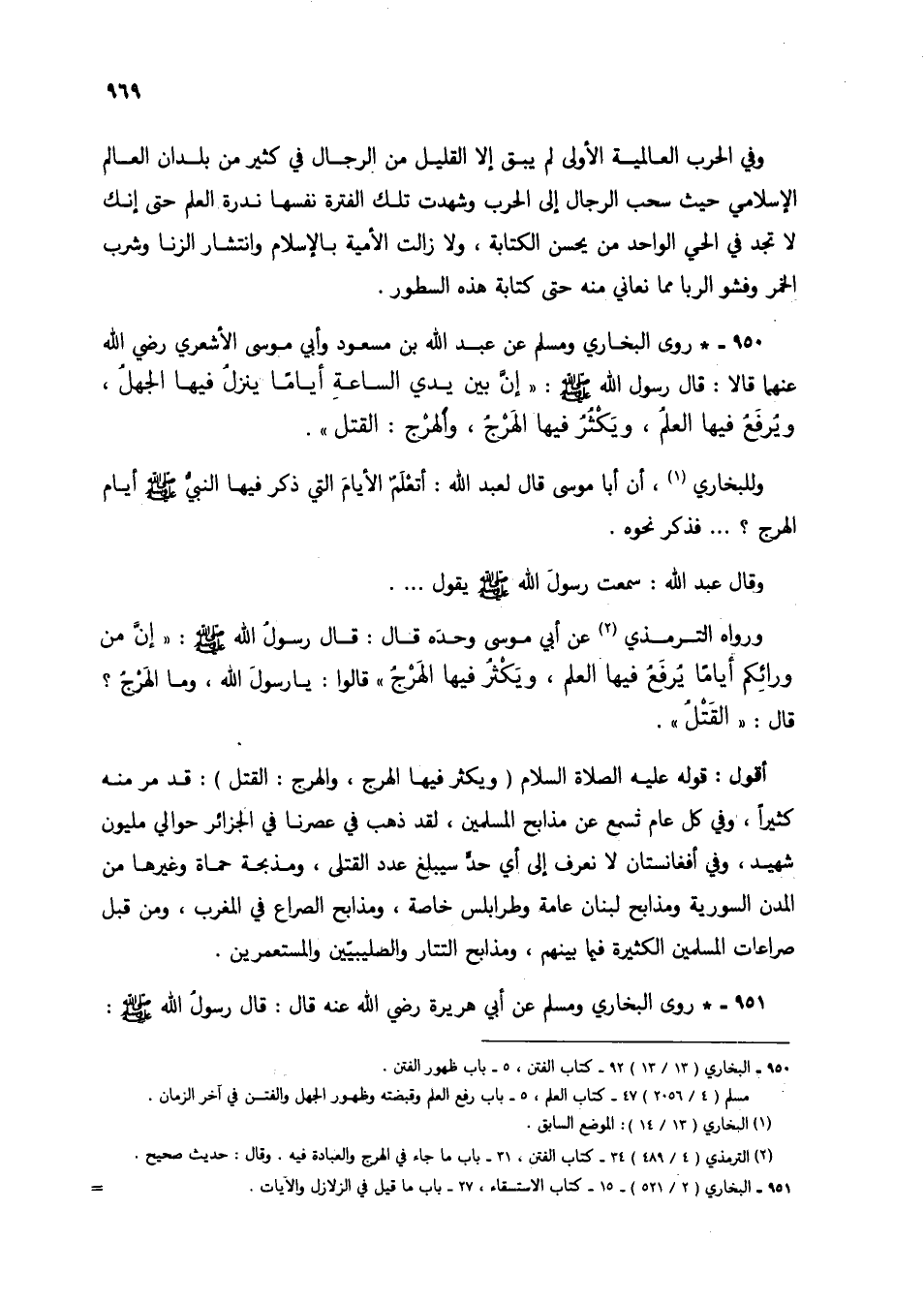 950 - * روى البخاري ومسلم عن عبد الله بن مسعود وأبي موسى الأشعري رضي الله عنهما قالا: قال رسول الله صلى الله عليه وسلم: "إن بين يدي الساعة أياماً ينزل فيها الجهل، ويرفع فيها العلم، ويكثر فيها الهرج، والهرج: القتل".
