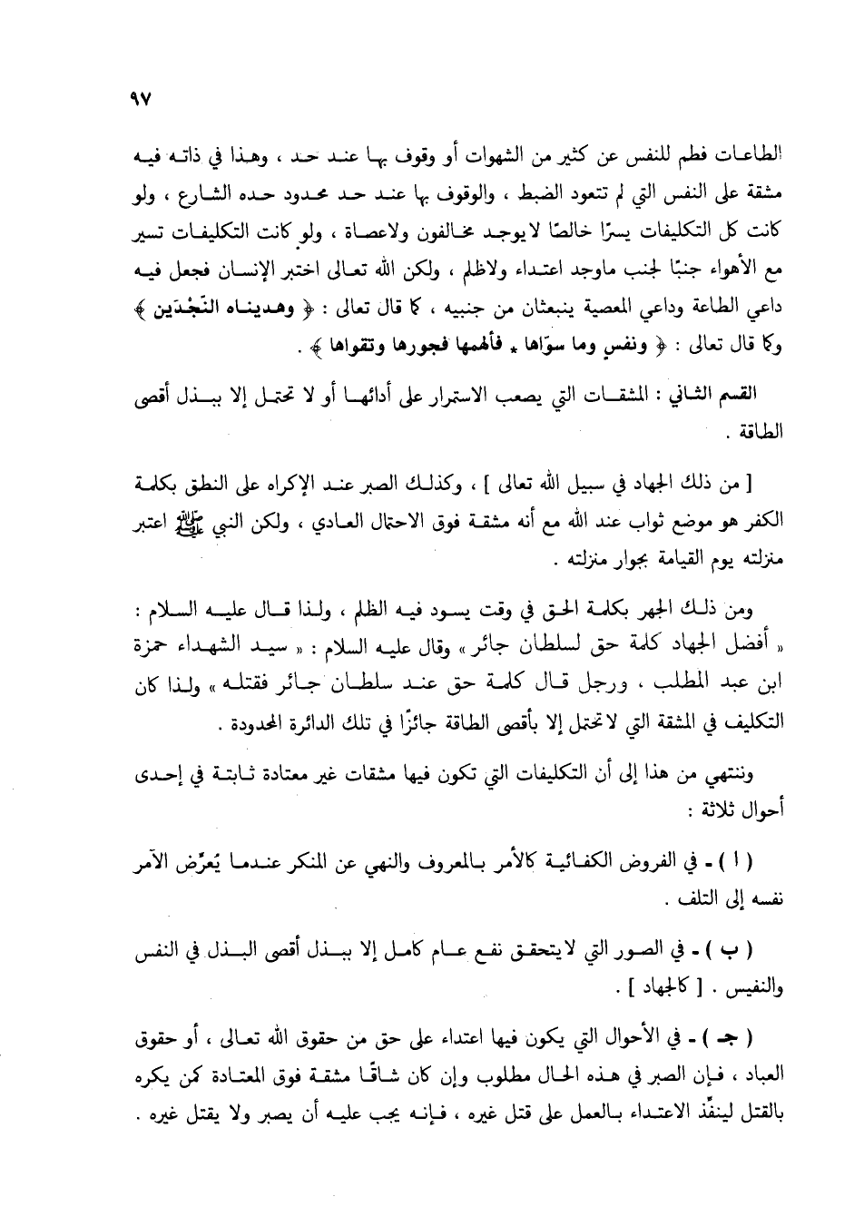 ومن ذلك الجهر بكلمة الحق في وقت يسود فيه الظلم، ولذا قال عليه السلام: "أفضل الجهاد كلمة حق لسلطان جائز" وقال عليه السلام: "سيد الشهداء حمزة ابن عبد المطلب، ورجل قال كلمة حق عند سلطان جائز فقتله" ولذا كان التكليف في المشقة التي لا تحتمل إلا بأقصى الطاقة جائزاً في تلك الدائرة المحدودة.