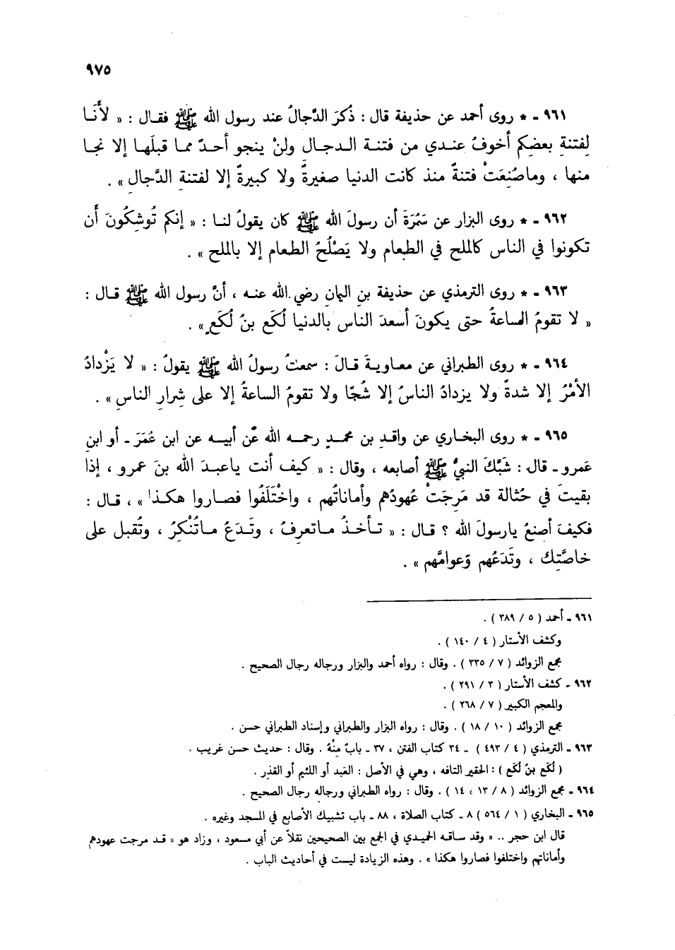961 - * روى أحمد عن حذيفة قال: ذكر الدجال عند رسول الله صلى الله عليه وسلم فقال: "لأنا لفتنة بعضكم أخوف عندي من فتنة الدجال ولن ينجو أحد مما قبلها إلا نجا منها، وما صنعت فتنة منذ كانت الدنيا صغيرة ولا كبيرة إلا لفتنة الدجال".