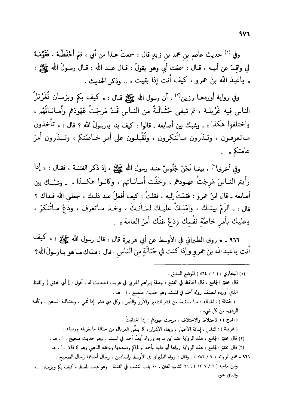 966 - * روى الطبراني في الأوسط عن أبي هريرة قال: قال رسول الله صلى الله عليه وسلم: "كيف أنت يا عبد الله بن عمرو وإذا كنت في حثالة من الناس" قال: فذاك ما هو يا رسول الله؟