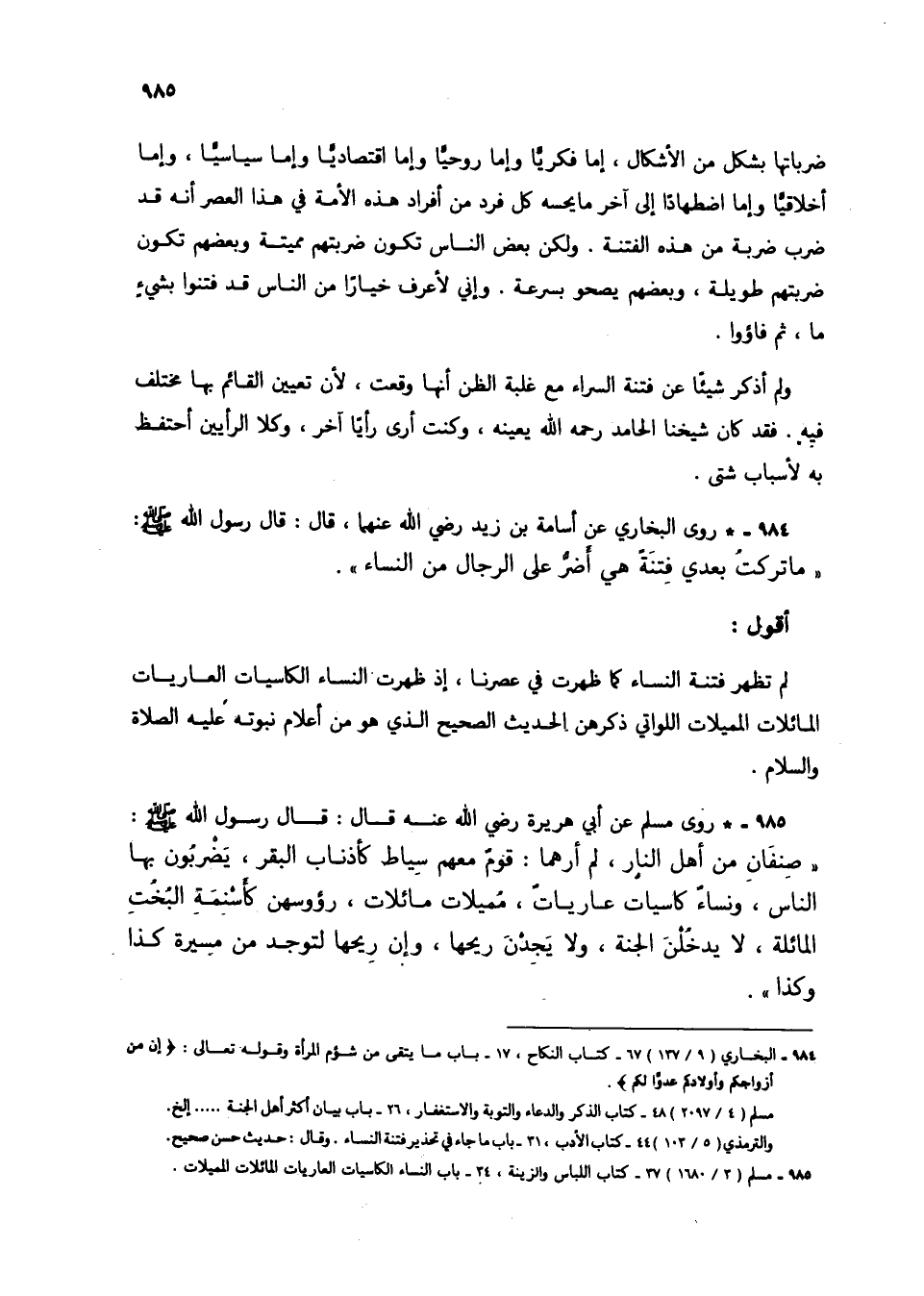 985 - * روى مسلم عن أبي هريرة رضي الله عنه قال: قال رسول الله صلى الله عليه وسلم: "صنفان من أهل النار، لم أرهما: قوم معهم سياط كأذناب البقر، يضربون بها الناس، ونساء كاسيات عاريات، مميلات مائلات، رؤوسهن كأسنمة البخت المائلة، لا يدخلن الجنة، ولا يجدن ريحها، وإن ريحها لتوجد من مسيرة كذا وكذا.