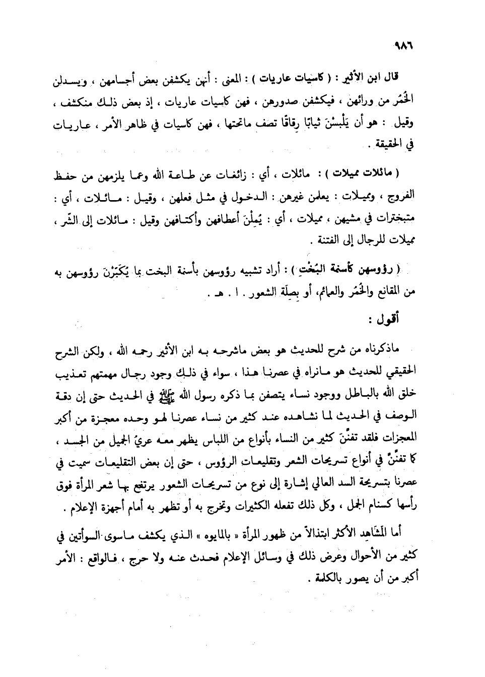 قال ابن الأثير: (كاسيات عاريات): المعنى: أنهن يكشفن بعض أجسامهن، ويسدلن الخمر من ورائهن، فيكشفن صدورهن، فهن كاسيات عاريات، إذ بعض ذلك منكشف، وقيل: هو أن يلبسن ثياباً رقاقاً تصف ما تحتها، فهن كاسيات في ظاهر الأمر، عاريات في الحقيقة.