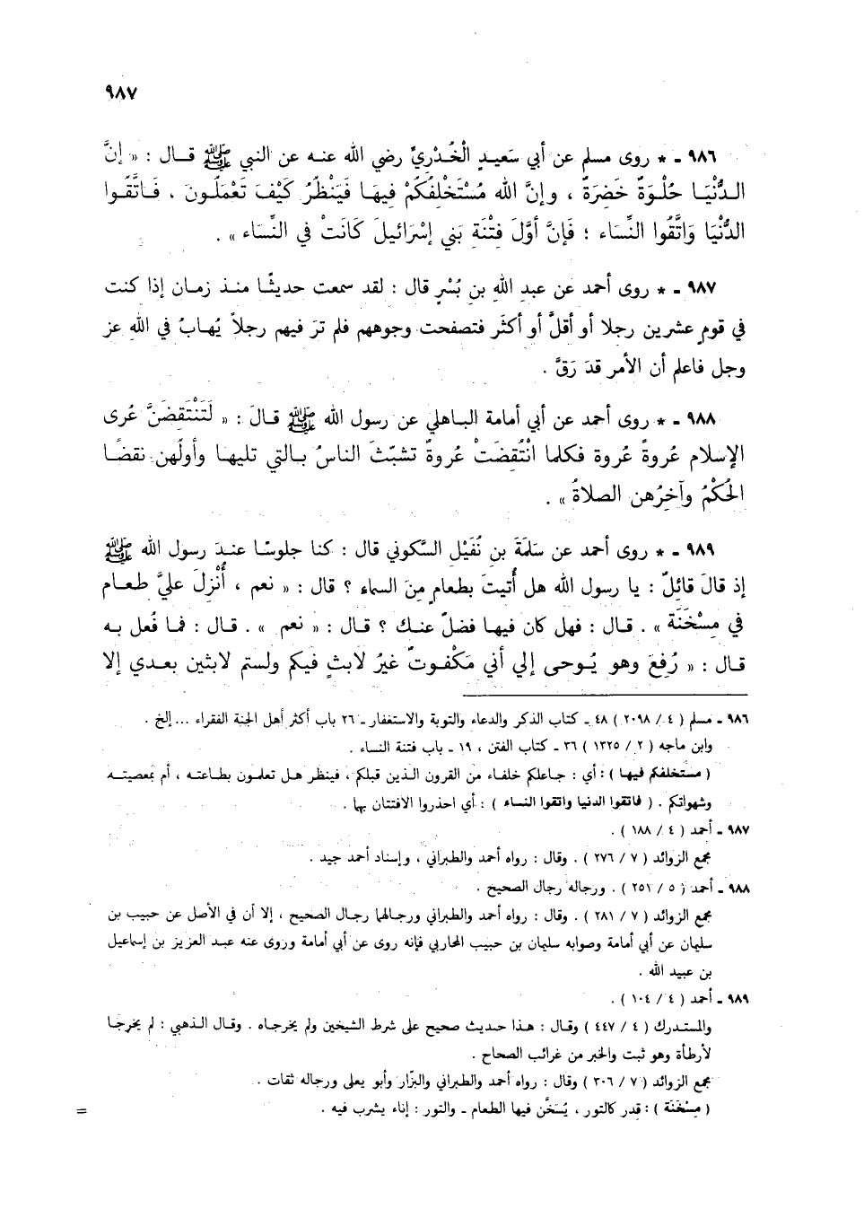 986 - * روى مسلم عن أبي سعيد الخدري رضي الله عنه عن النبي صلى الله عليه وسلم قال: "إن الدنيا حلوة خضرة، وإن الله مستخلفكم فيها فينظر كيف تعملون، فاتقوا الدنيا واتقوا النساء؛ فإن أول فتنة بني إسرائيل كانت في النساء".