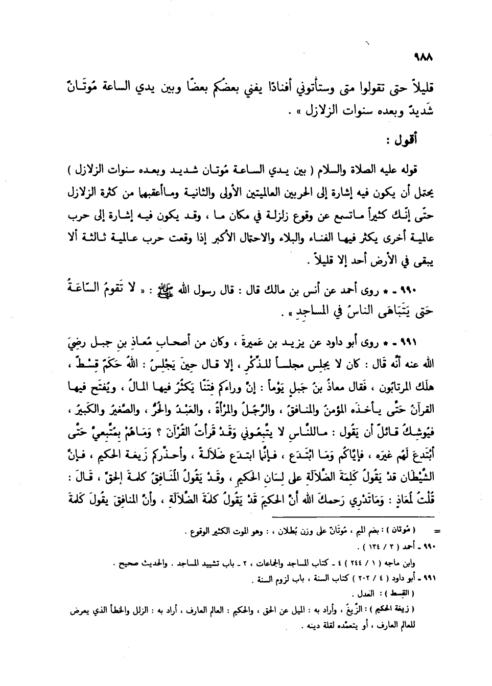 990 - * روى أحمد عن أنس بن مالك قال: قال رسول الله صلى الله عليه وسلم: "لا تقوم الساعة حتى يتباهى الناس في المساجد".