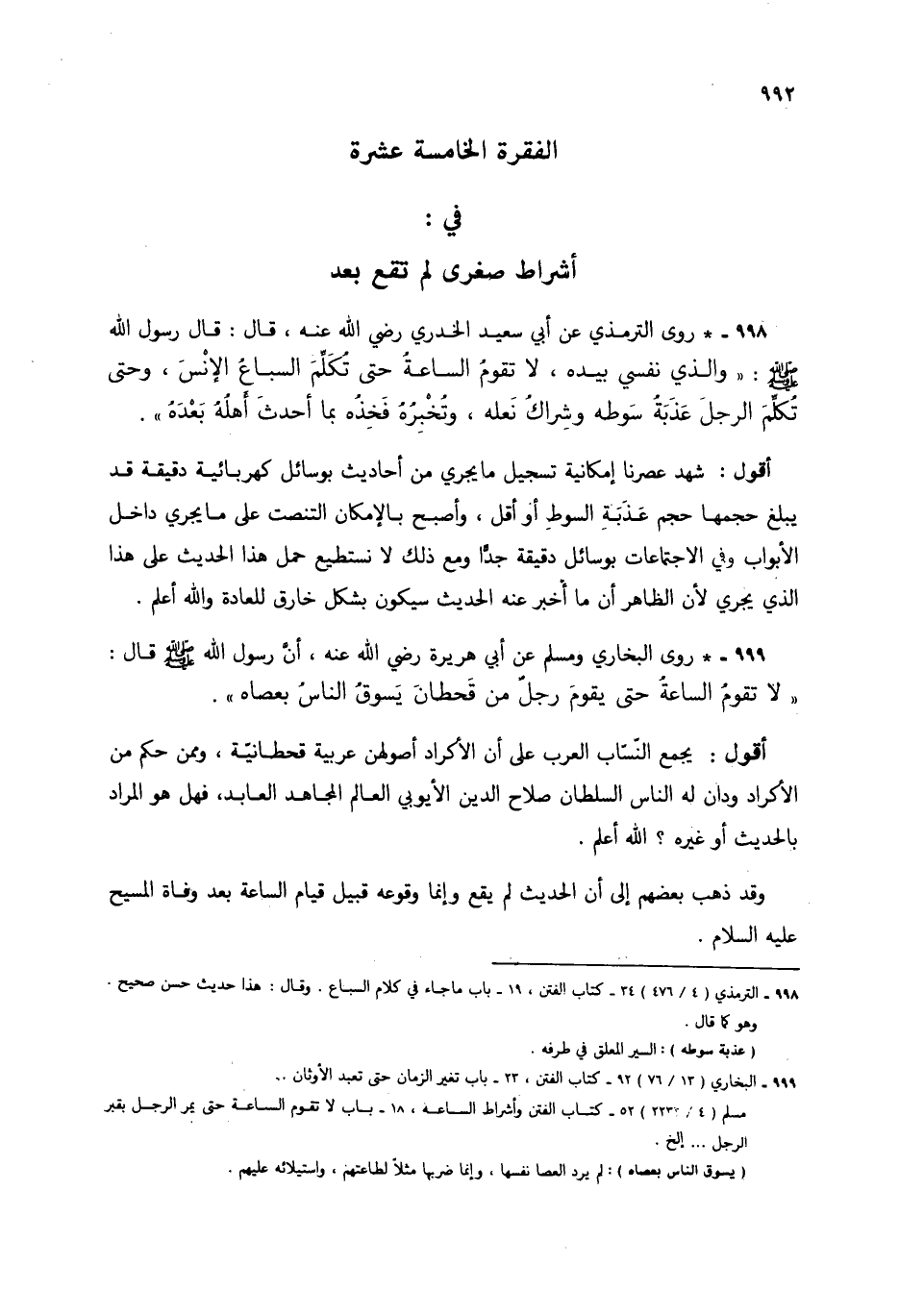 999 - * روى البخاري ومسلم عن أبي هريرة رضي الله عنه، أن رسول الله صلى الله عليه وسلم قال: "لا تقوم الساعة حتى يقوم رجل من قحطان يسوق الناس بعصاه".