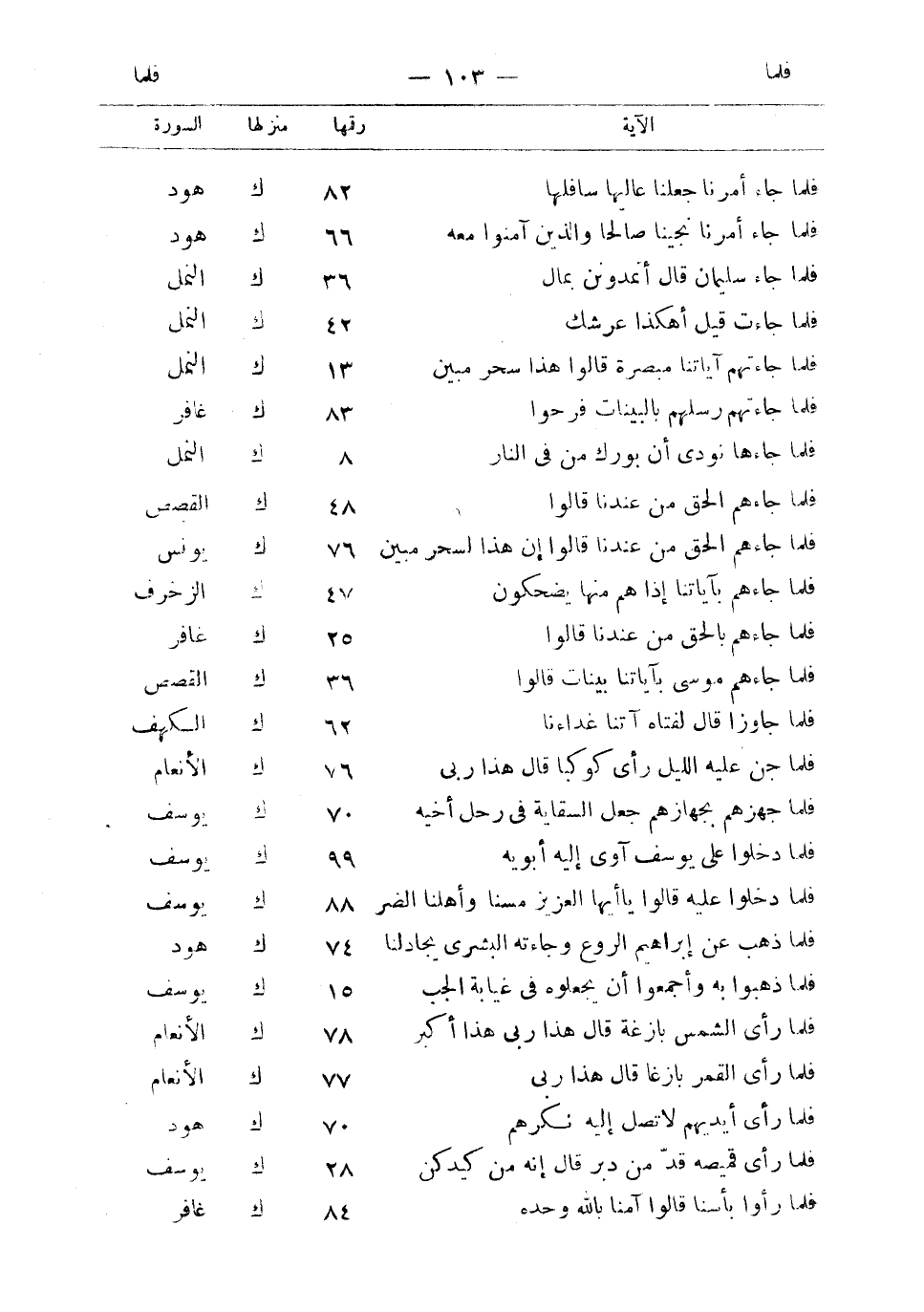 فلما جاء أمرنا جعلنا عاليها سافلها 82 ك هود فلما جاء أمرنا نجينا صالحا والذين آمنوا معه 66 ك هود فلما جاء سليمان قال أتمدونن بمال 36 ك النمل فلما جاءت قيل أهكذا عرشك 42 ك النمل فلما جاءتهم آياتنا مبصرة قالوا هذا سحر مبين 13 ك النمل فلما جاءتهم رسلهم بالبينات فرحوا 83 ك غافر فلما جاءها نودي أن بورك من في النار 8 ك النمل فلما جاءهم الحق من عندنا قالوا 48 ك القصص فلما جاءهم الحق من عندنا قالوا إن هذا لسحر مبين 76 ك يونس فلما جاءهم بآياتنا إذا هم منها يضحكون 47 ك الزخرف فلما جاءهم بالحق من عندنا قالوا 25 ك غافر فلما جاءهم موسى بآياتنا بينات قالوا 36 ك القصص فلما جاوزا قال لفتاه آتنا غداءنا 62 ك الكهف فلما جن عليه الليل رأى كوكبا قال هذا ربي 76 ك الأنعام فلما جهزهم بجهازهم جعل السقاية في رحل أخيه 70 ك يوسف فلما دخلوا على يوسف آوى إليه أبويه 99 ك يوسف فلما دخلوا عليه قالوا يا أيها العزيز مسنا وأهلنا الضر 88 ك يوسف فلما ذهب عن إبراهيم الروع وجاءته البشرى يجادلنا 74 ك هود فلما ذهبوا به وأجمعوا أن يجعلوه في غيابة الجب 15 ك يوسف