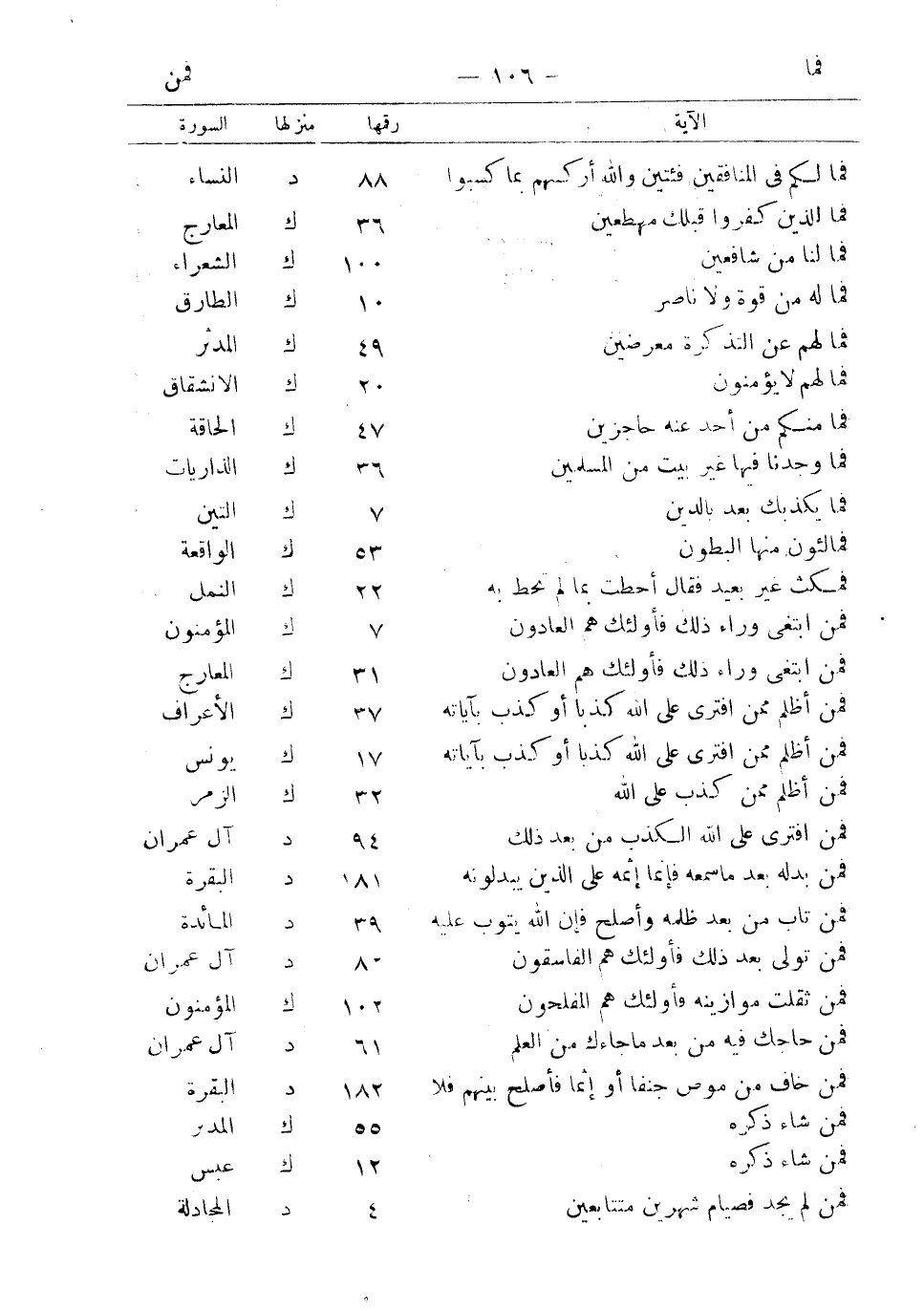فمالكم في المنافقين فئتين والله أركسهم بما كسبوا 88 د النساء فما للذين كفروا قبلك مهطعين 36 ك المعارج فما لنا من شافعين 100 ك الشعراء فما له من قوة ولا ناصر 10 ك الطارق فما لهم عن التذكرة معرضين 49 ك المدثر فما لهم لا يؤمنون 20 ك الانشقاق فما منكم من أحد عنه حاجزين 47 ك الحاقة فما وجدنا فيها غير بيت من المسلمين 36 ك الذاريات فما يكذبك بعد بالدين 7 ك التين فمالئون منها البطون 53 ك الواقعة فمكث غير بعيد قال أحطت بما لم تحط به 22 ك النمل