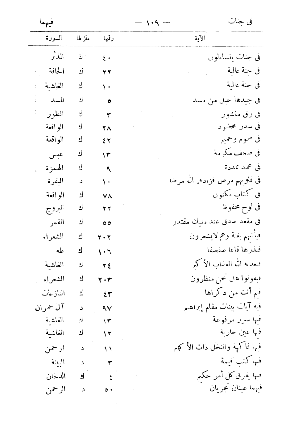 في جنة عالية 10 ك الغاشية في جيدها حبل من مسد 5 ك المسد في رق منشور 3 ك الطور في سدر مخضود 28 ك الواقعة في سموم وحميم 42 ك الواقعة في صحف مكرمة 13 ك عبس في عمد ممددة 9 ك الهمزة في قلوبهم مرض فزادهم الله مرضا 10 د البقرة في كتاب مكنون 78 ك الواقعة في لوح محفوظ 22 ك البروج في مقعد صدق عند مليك مقتدر 55 ك القمر فيأتيهم بغتة وهم لا يشعرون 202 ك الشعراء فيذرها قاعا صفصفا 106 ك طه فيعذبه الله العذاب الأكبر 24 ك الغاشية فيقولوا هل نحن منظرون 203 ك الشعراء فيم أنت من ذكراها 43 ك النازعات فيه آيات بينات مقام إبراهيم 97 د آل عمران فيها سرر مرفوعة 13 ك الغاشية فيها عين جارية 12 ك الغاشية فيها فاكهة والنخل ذات الأكمام 11 د الرحمن فيها كتب قيمة 3 د البينة فيها يفرق كل أمر حكيم 4 ك الدخان