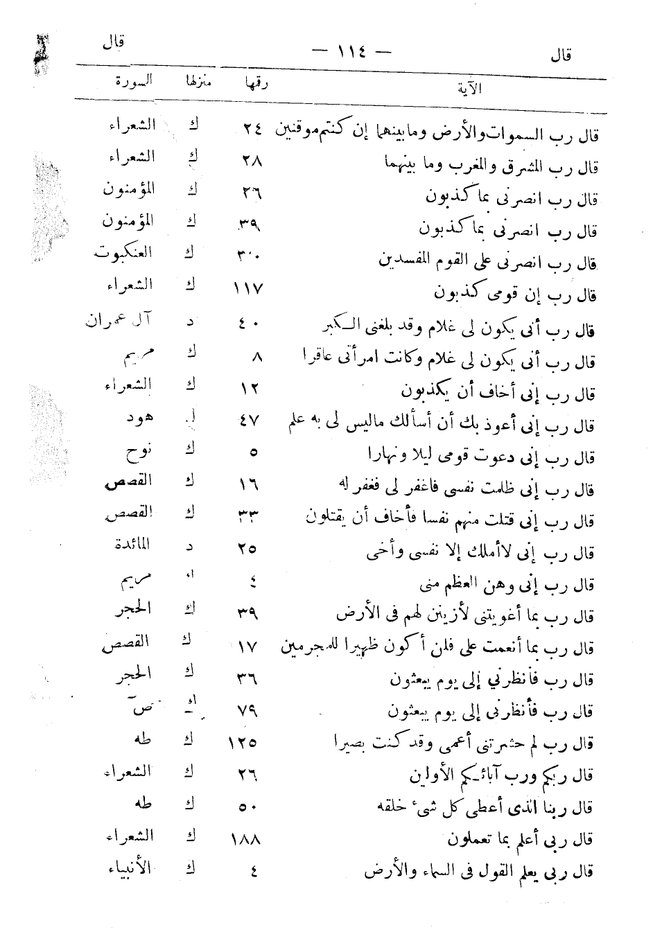 قال رب السموات والأرض وما بينهما إن كنتم موقنين 24 ك الشعراء قال رب المشرق والمغرب وما بينهما 28 ك الشعراء قال رب انصرني بما كذبون 26 ك المؤمنون قال رب انصرني بما كذبون 39 ك المؤمنون قال رب انصرني على القوم المفسدين 30 ك العنكبوت قال رب إن قومي كذبون 117 ك الشعراء قال رب أنى يكون لي غلام وقد بلغني الكبر 40 د آل عمران قال رب أنى يكون لي غلام وكانت أمرأتي عاقرا 8 ك مريم قال رب إني أخاف أن يكذبون 12 ك الشعراء قال رب إني أعوذ بك أن أسألك ما ليس لي به علم 47 ك هود قال رب إني دعوت قومي ليلا ونهارا 5 ك نوح قال رب إني ظلمت نفسي فاغفر لي فغفر له 16 ك القصص قال رب إني قتلت منهم نفسا فأخاف أن يقتلون 33 ك القصص قال رب إني لا أملك إلا نفسي وأخي 25 د المائدة قال رب إني وهن العظم مني 4 ك مريم