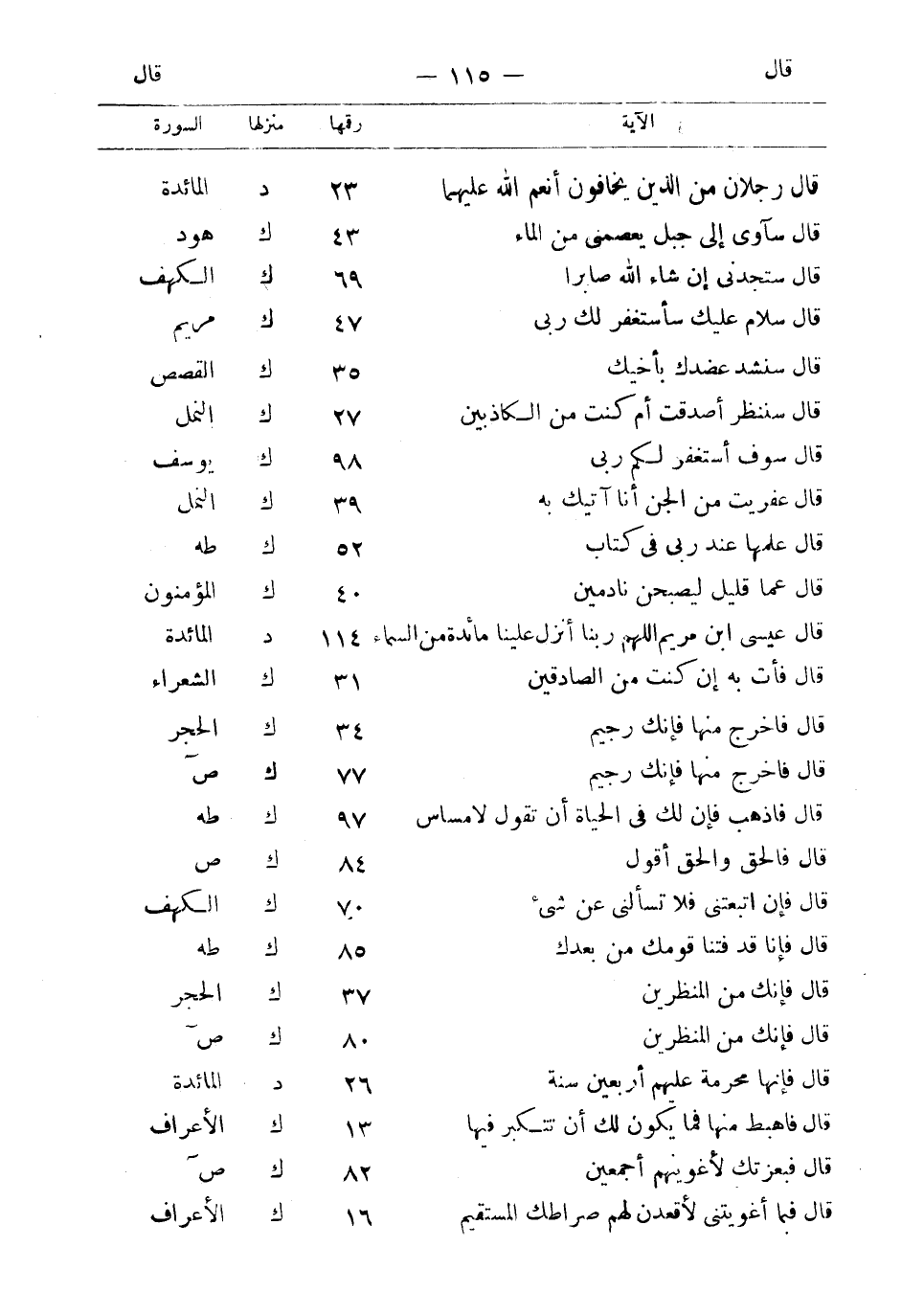 قال رجلان من الذين يخافون أنعم الله عليهما 23 د المائدة قال سآوي إلى جبل يعصمني من الماء 43 ك هود قال ستجدني إن شاء الله صابرا 69 ك الكهف قال سلام عليك سأستغفر لك ربي 47 ك مريم قال سنشد عضدك بأخيك 35 ك القصص قال سننظر أصدقت أم كنت من الكذبين 27 ك النمل قال سوف أستغفر لكم ربي 98 ك يوسف قال عفريت من الجن أنا آتيك به 39 ك النمل قال علمها عند ربي في كتاب 52 ك طه قال عما قليل ليصبحن نادمين 40 ك المؤمنون قال عيس ابن مريم اللهم ربنا أنزل علينا مائدة من السماء 114 د المائدة قال فأت به إن كنت من الصادقين 31 ك الشعراء