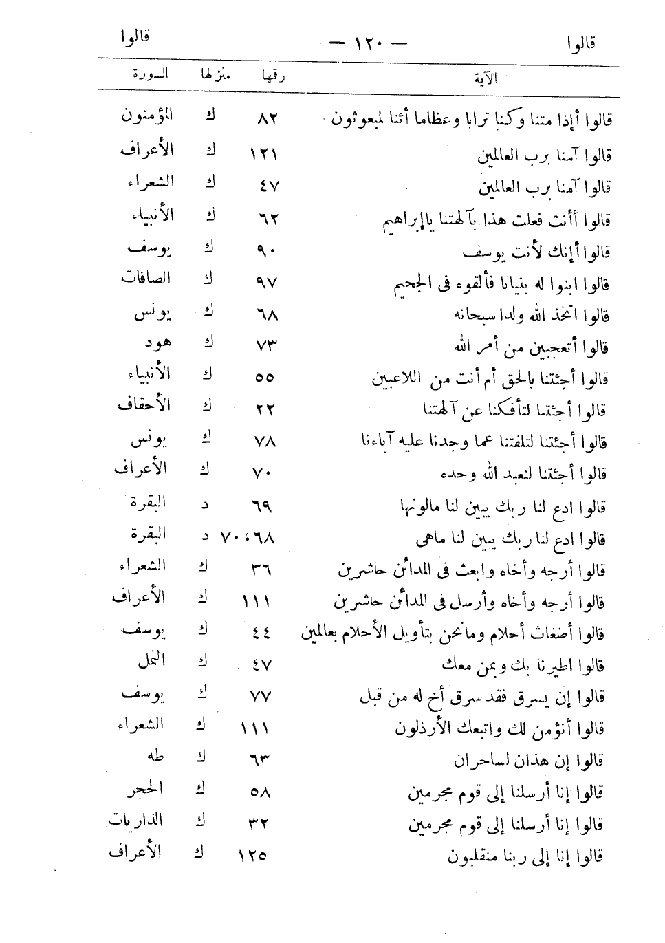 قالوا أإذا متنا وكنا ترابا وعظاما أئنا لمبعوثون 82 ك المؤمنون قالوا آمنا برب العالمين 121 ك الأعراف قالوا آمنا برب العالمين 47 ك الشعراء قالوا أأنت فعلت هذا بآلهتنا يا إبراهيم 62 ك الأنبياء قالوا أإنك لأنت يوسف 90 ك يوسف قالوا ابنوا له بنيانا فألقوه في الجحيم 97 ك الصافات قالوا اتخذ الله ولدا سبحانه 68 ك يونس قالوا أتعجبين من أمر الله 73 ك هود قالوا أجئتنا بالحق أم أنت من اللاعبين 55 ك الأنبياء قالوا أجئتنا لتأفكنا عن آلهتنا 22 ك الأحقاف قالوا أجئتنا لتلفتنا عما وجدنا عليه آباءنا 78 ك يونس قالوا أجئتنا لنعبد الله وحده 70 ك الأعراف قالوا ادع لنا ربك يبين لنا ما لونها 69 د البقرة قالوا ادع لنا ربك يبين لنا ما هي 68، 70 د البقرة قالوا أرجه وأخاه وابعث في المدائن حاشرين 36 ك الشعراء قالوا أرجه وأخاه وأرسل في المدائن حاشرين 111 ك الأعراف قالوا أضغاث أحلام وما نحن بتأويال الأحلام بعالمين 44 ك يوسف قالوا اطيرنا بك وبمن معك 47 ك النمل قالوا إن يسرق فقد سرق أخ له من قبل 77 ك يوسف قالوا أنؤمن لك واتبعك الأرذلون 111 ك الشعراء قالوا إن هذان لساحران 63 ك طه