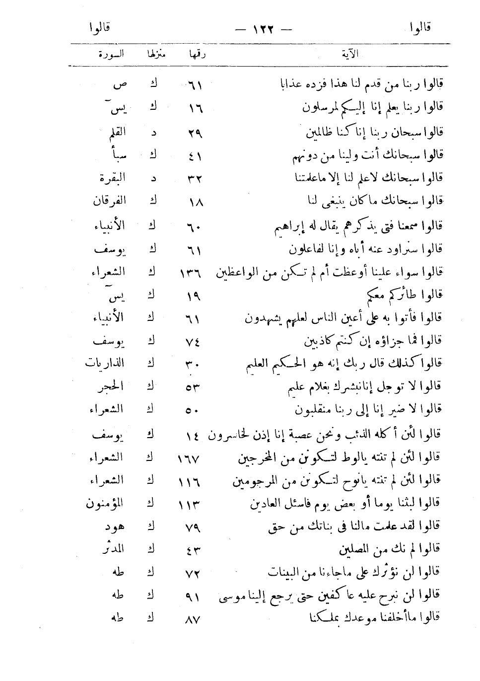 قالوا لا ضير إنا إلى ربنا منقلبون 50 ك الشعراء قالوا لئن أكله الذئب ونحن عصبة إنا إذن لخاسرون 14 ك يوسف قالوا لئن لم تنته يا لوط لتكونن من المخرجين 167 ك الشعراء قالوا لئن لم تنته يا نوح لتكونن من المرجومين 116 ك الشعراء قالوا لبثنا يوما أو بعض يوم فاسئل العادين 113 ك المؤمنون قالوا لقد علمت ما لنا في بناتك من حق 79 ك هود قالوا لم نك من المصلين 43 ك المدثر قالوا لن نؤثرك على ما جاءنا من البينات 72 ك طه قالوا لن نبرح عليه عاكفين حتى يرجع إلينا موسى 91 ك طه قالوا ما أخلفنا موعدك بملكنا 87 ك طه