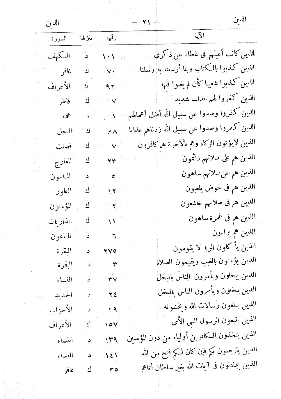 الذين كانت أعينهم في غطاء من ذكري 101 د الكهف الذين كذبوا بالكتاب وبما أرسلنا به رسلنا 70 ك غافر الذين كذبوا شعيبا كأن لم يغنوا فيها 92 ك الأعراف الذين كفروا لهم عذاب شديد 7 ك فاطر الذين كفروا وصدوا عن سبيل الله أضل أعمالهم 1 د محمد الذين كفروا وصدوا عن سبيل الله زدناهم عذابا 88 ك النحل الذين لا يؤتون الزكاة وهم بالآخرة هم كافرون 7 ك فصلت الذين هم على صلاتهم دائمون 23 ك المعارج الذين هم عن صلاتهم ساهون 5 د الماعون الذين هم في خوض يلعبون 12 ك الذين هم في صلاتهم خاشعون 2؟ المؤمنون الذين هم في غمرة ساهون؟ ك الذاريات الذين هم يراءون؟ د الماعون الذين يأكلون الربا لا يقومون 275 د البقرة الذين يؤمنون بالغيب ويقيمون الصلاة 3؟ ؟ الذين يبخلون ويأمرون الناس بالبخل 37؟ ؟ الذين يبخلون ويأمرون؟ 24؟ الذين؟ الذين يتبعون الرسول الأمي؟ الذين يتخذون؟ الذين يتربصون بكم فإن؟ الذين يجادلون في آيات الله؟
