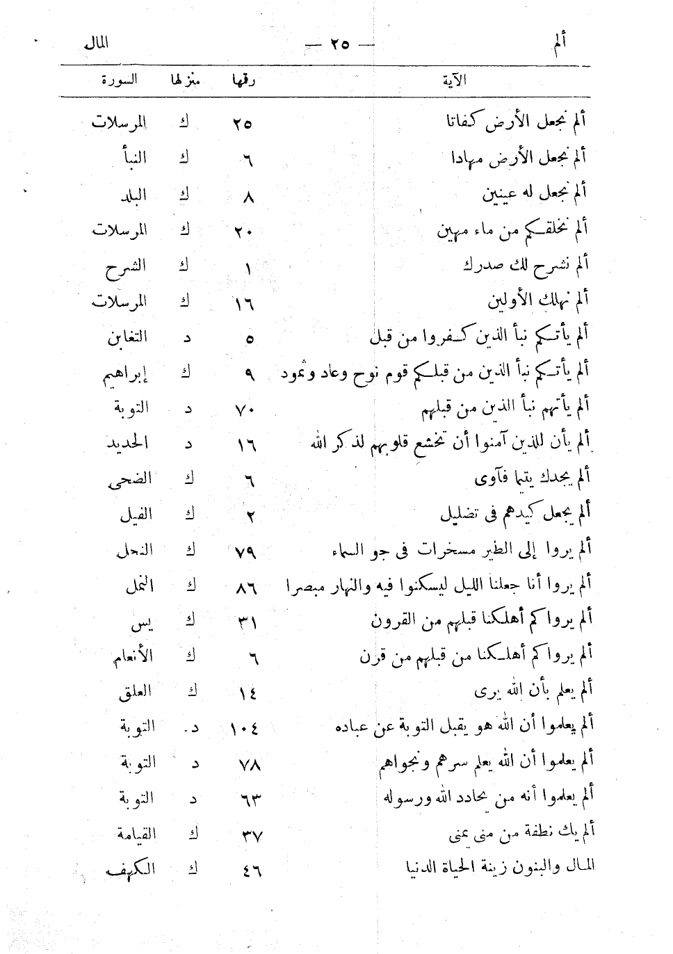 ألم نجعل الأرض كفاتا 25 ك المرسلات ألم نجعل الأرض مهادا 6 ك النبأ ألم نجعل له عينين 8 ك البلد ألم نخلقكم من ماء مهين 20 ك المرسلات ألم نشرح لك صدرك 1 ك الشرح ألم نهلك الأولين 16 ك المرسلات ألم يأتكم نبأالذين كفروا من قبل 5 د التغابن ألم يأتكم نبأ الذين من قبلكم قوم نوح وعاد وثمود 9 ك إبراهيم أيأتهم نبأ الذين من قبلهم 70 د التوبة ألم يأن للذين آمنوا أن تخشع قلوبهم لذكر الله 16 د الحديد ألم يجدك يتيم فآوى 6 ك الضحى ألم يجعل كيدهم في تضليل 2 ك الفيل ألم يروا إلى الطير مسخرات في جو السماء 79 ك النحل ألم يروا أنا جعلنا الليل ليسكنوا فيه والنهار مبصرا 86 ك النمل ألم يروا كم أهلكنا قبلهم من القرون 31 ك يس ألم يروا كم أهلكنا من قبلهم من قرن 6 ك الأنعام ألم يعلم بأن الله يرى 14 ك العلق ألم يعلموا أن الله هو يقبل التوبة عن عباده 104 د التوبة ألم يعلموا أن الله يعلم سرهم ونجواهم 78 د التوبة ألم يعلموا أنه من يجادل الله ورسوله 63 د التوبة ألم يك نطفة من مني يمنى 37 ك القيامة