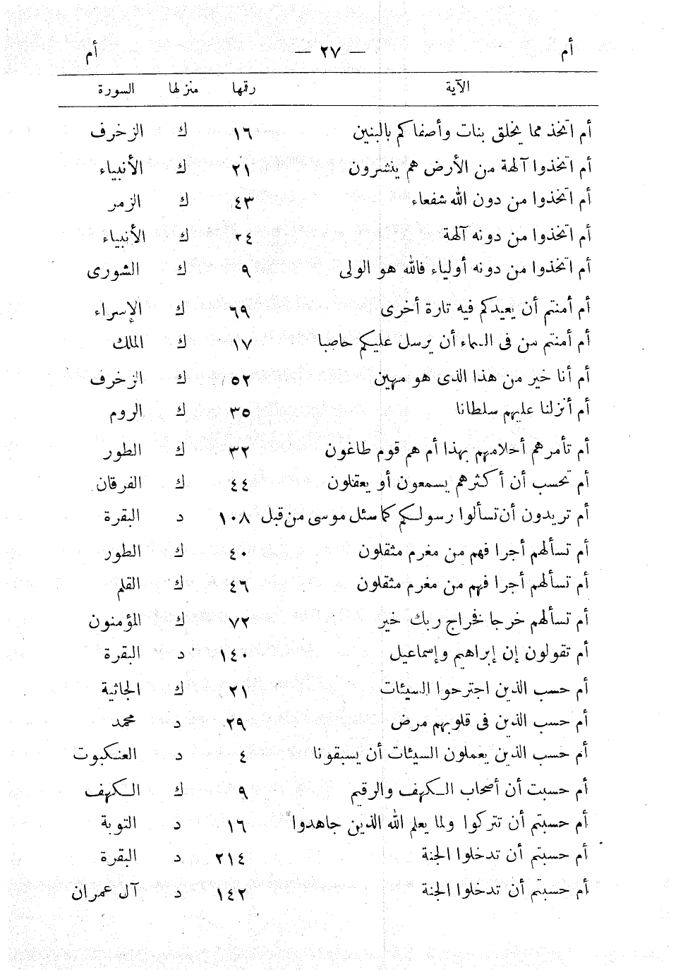 أم اتخذ مما يخلق بناتا وأصفاكم بالبنين 16 ك الزخرف أم اتخذوا آلهة من الأرض هم ينشرون 21 ك الأنبياء أم اتخذوا من دون الله شفعاء 43 ك الزمر أم اتخذوا من دونه آلهة 24 ك الأنبياء أم اتخذوا من دونه أولياء فالله هو الولى 9 ك الشورى أم أمنتم أن يعيدكم فيه تارة أخرى 69 ك الإسراء أم أمنتم من في السماء أن يرسل عليكم حاصبا 17 ك الملك أم أنا خير من هذا الذي هو مهين 52 ك الزخرف أم أنزلنا عليهم سلطانا 35 ك الروم أم تأمرهم أحلامهم بهذا أم هم قوم طاغون 32 ك الطور أم تحسب أن أكثرهم يسمعون أو يعقلون 44 ك الفرقان أم تريدون أن تسألوا رسولكم كما سئل موسى من قبل 108 د البقرة أم تسألهم أجرا فهم من مغرم مثقلون 40 ك الطور أم تسألهم أجرا فهم من مغرم مثقلون 46 ك القلم أم تسألهم خرجا فخراج ربك خير 72 ك المؤمنون أم تقولون أن إبراهيم وإسماعيل 140 د البقرة أم حسب الذين اجترحوا السيئات 21 ك الجاثية أم حسب الذين في قلوبهم مرض 29 د محمد أم حسب الذين يعملون السيئات أن يسبقونا 4 د العنكبوت أم حسبت أن أصحاب الكهف والرقيم 9 ك الكهف أم حسبتم أن تتركوا ولما يعلم الله الذين جاهدوا 16 د التوبة