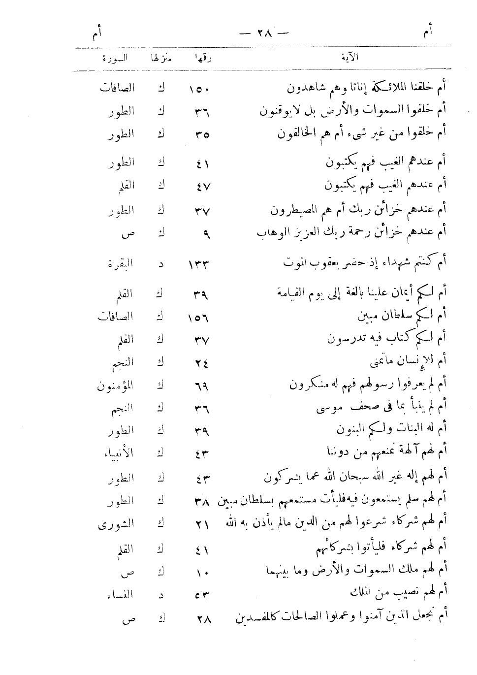 أم لهم ملك السموات والأرض وما بينهما 10 ك ص أم لهم نصيب من الملك 53 د النساء أم نجعل الذين آمنوا وعملوا الصالحات كالمفسدين 28 ك ص