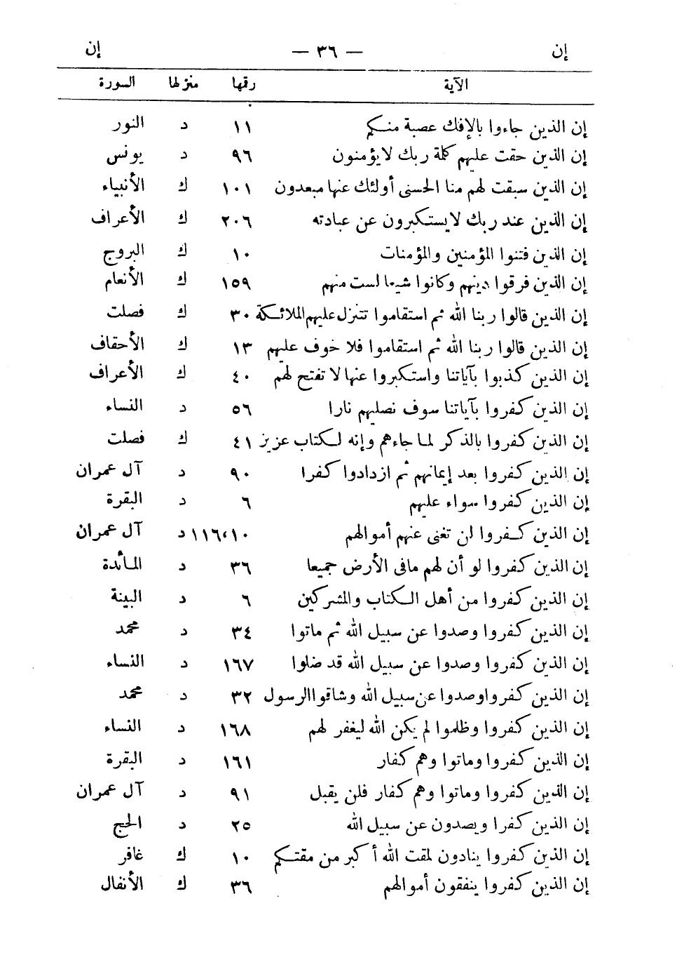 إن الذين عند ربك لا يستكبرون عن عبادته 206 ك الأعراف إن الذين فتنوا المؤمنين والمؤمنات 10 ك البروج إن الذين فرقوا دينهم وكانوا شيعا لست منهم 159 ك الأنعام إن الذين قالوا ربنا الله ثم استقاموا تتنزل عليهم الملائكة 30 ك فصلت إن الذين قالوا ربنا الله ثم استقاموا فلا خوف عليهم 13 ك الأحقاف إن الذين كذبوا بآياتنا واستكبروا عنها لا تفتح لهم 40 ك الأعراف إن الذين كفروا بآياتنا سوف نصليهم نارا 56 د النساء إن الذين كفروا بالذكر لما جاءهم وإنه لكتاب عزيز 41 ك فصلت إن الذين كفروا بعد إيمانهم ثم ازدادوا كفرا 90 د آل عمران إن الذين كفروا سواء عليهم 6 د البقرة إن الذين كفروا لن تغني عنهم أموالهم 10، 116 د آل عمران إن الذين كفروا لو أن لهم ما في الأرض جميعا 36 د المائدة إن الذين كفروا من أهل الكتاب والمشركين 6 د البينة إن الذين كفروا وصدوا عن سبيل الله ثم ماتوا 34 د محمد إن الذين كفروا وصدوا عن سبيل الله قد ضلوا 167 د النساء إن الذين كفروا وصدوا عن سبيل الله وشاقوا الرسول 32 د محمد إن الذين كفروا وظلموا لم يكن الله ليغفر لهم 168 د النساء إن الذين كفروا وماتوا وهم كفار 161 د البقرة إن الذين كفروا وماتوا وهم كفار فلن يقبل 91 د آل عمران إن الذين كفروا ويصدون عن سبيل الله 25 د الحج إن الذين كفروا ينادون لمقت الله أكبر من مقتكم 10 ك غافر إن الذين كفروا ينفقون أموالهم 36 ك الأنفال