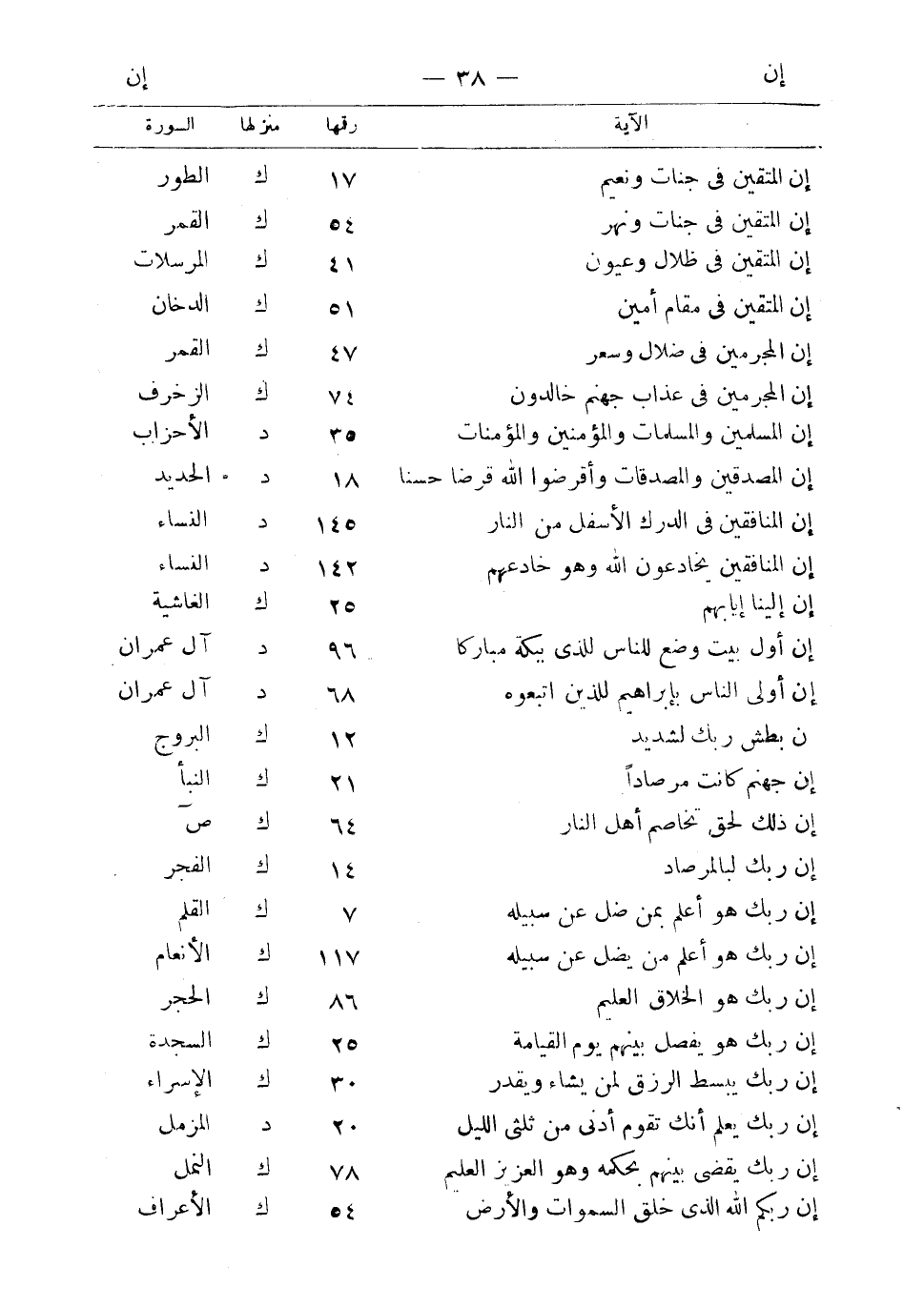 إن المتقين في جنات ونعيم 17 ك الطور إن المتقين في جنات ونهر 54 ك القمر إن المتقين في ظلال وعيون 41 ك المرسلات إن المتقين في مقام أمين 51 ك الدخان إن المجرمين في ضلال وسعر 47 ك القمر إن المجرمين في عذاب جهنم خالدون 74 ك الزخرف إن المسلمين والمسلمات والمؤمنين والمؤمنات 35 د الأحزاب إن المصدقين والمصدقات وأقرضوا الله قرضا حسنا 18 د الحديد إن المنافقين في الدرك الأسفل من النار 145 د النساء إن المنافقين يخادعون الله وهو خادعهم 142 د النساء إن إلينا إيابهم 25 ك الغاشية إن أول بيت وضع للناس للذي ببكة مباركا 96 د آل عمران إن أولى الناس بإبراهيم للذين اتبعوه 68 د آل عمران إن بطش ربك لشديد 12 ك البروج إن جهنم كانت مرصادا 21 ك النبأ إن ذلك لحق تخاصم أهل النار 64 ك ص إن ربك لبالمرصاد 14 ك الفجر إن ربك هو أعلم بمن ضل عن سبيله 7 ك القلم إن ربك هو أعلم من ضل عن سبيله 117 ك الأنعام