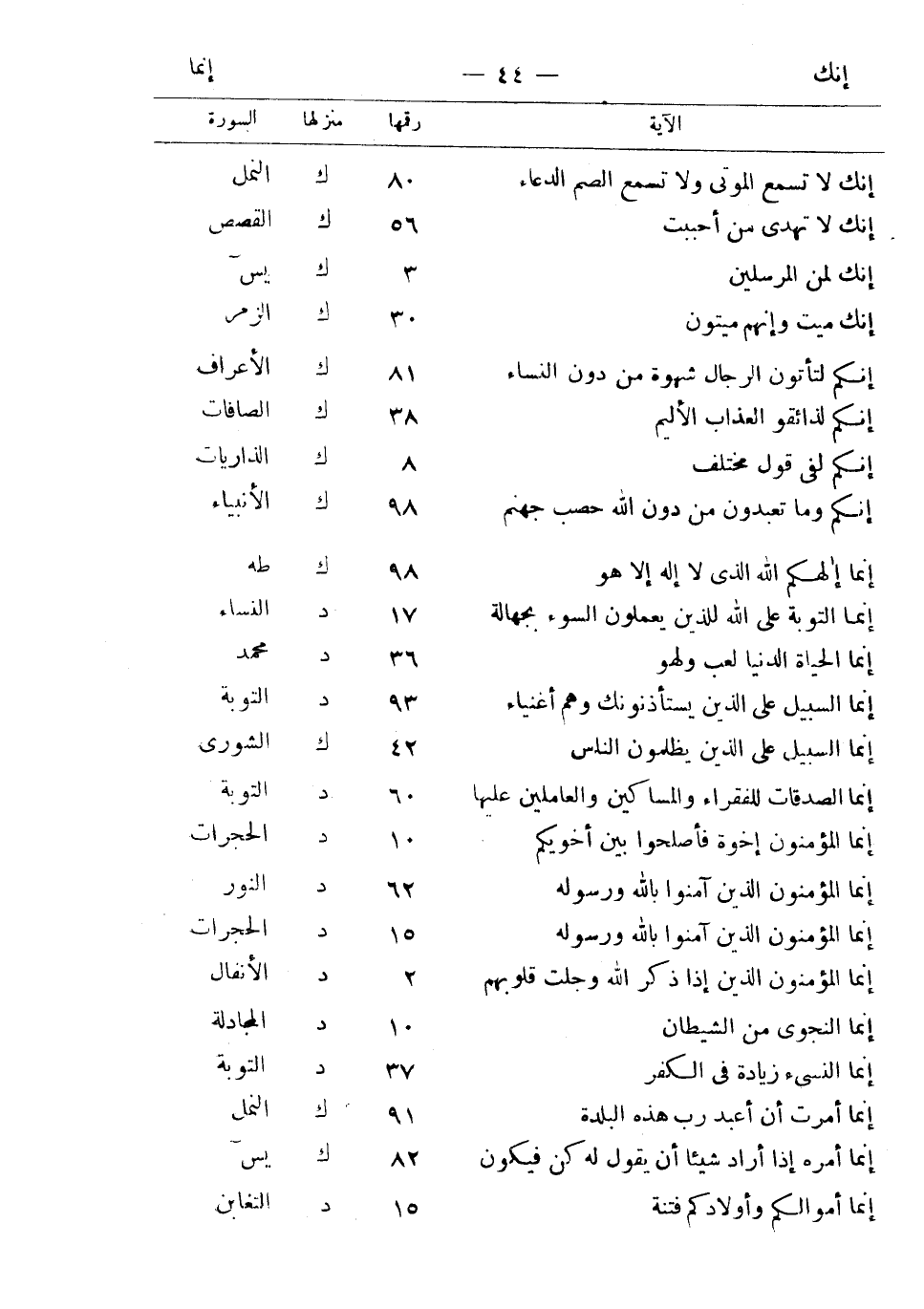 إنك لا تسمع الموتى ولا تسمع الصم الدعاء 80 ك النمل إنك لا تهدي من أحببت 56 ك القصص إنك لمن المرسلين 3 ك يس إنك ميت وهم ميتون 30 ك الزمر إنكم لتأتون الرجال شهوة من دون النساء 81 ك الأعراف إنكم لذائقوا العذاب الأليم 38 ك الصافات إنكم لفي قول مختلف 8 ك الذاريات إنكم وما تعبدون من دون الله حصب جهنم 98 ك الأنبياء إنما إلهكم الله الذى لا إله إلا هو 98 ك طه إنما التوبة على الله للذين يعملون السوء بجهالة 17 د النساء إنما الحياة الدنيا لعب ولهو 36 د محمد إنما السبيل على الذين يستأذنونك وهم أغنياء 93 د التوبة إنما السبيل على الذين يظلمون الناس 42 ك الشورى إنما الصدقات للفقراء والمساكين والعاملين عليها 60 د التوبة إنما المؤمنون إخوة فأصلحوا بين أخويكم 10 د الحجرات إنما المؤمنون الذين آمنوا بالله ورسوله 62 د النور إنما المؤمنون الذين آمنوا بالله ورسوله 15 د الحجرات إنما المؤمنون الذين إذا ذكر الله وجلت قلوبهم 2 د الأنفال إنما النجوى من الشيطان 10 د المجادلة إنما النسئ زيادة في الكفر 37 د التوبة