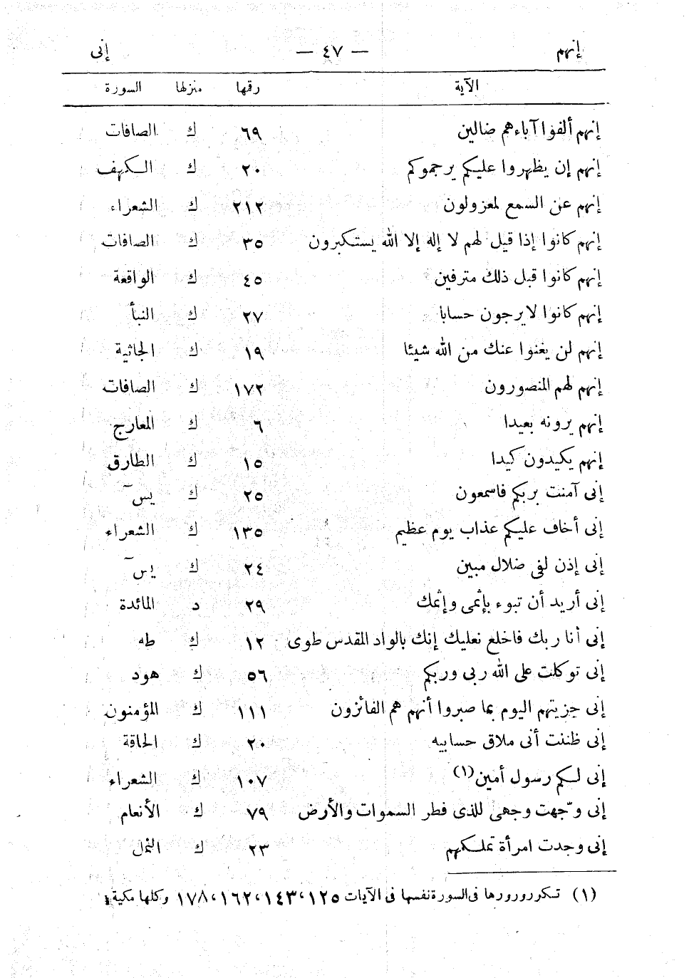 إنهم ألفوا آباءهم ضالين 69 ك الصافات إنهم إن يظهروا عليكم يرجموكم 20 ك الكهف إنهم عن السمع لمعزولون 212 ك الشعراء إنهم كانوا إذا قيل لهم لا إله إلا الله يستكبرون 35 ك الصافات إنهم كانوا قبل ذلك مترفين 45 ك الواقعة إنهم كانوا لا يرجون حسابا 27 ك النبأ إنهم لن يغنوا عنك من الله شيئا 19 ك الجاثية إنهم لهم المنصورون 172 ك الصافات إنهم يرونه بعيدا 6 ك المعارج إنهم يكيدون كيدا 15 ك الطارق إني آمنت بربكم فاسمعون 25 ك يس إني أخاف عليكم عذاب يوم عظيم 135 ك الشعراء إني إذا لفى ظلال مبين 24 ك يس إني أريد أن تبوء بإثمي وإثمك 29 د المائدة