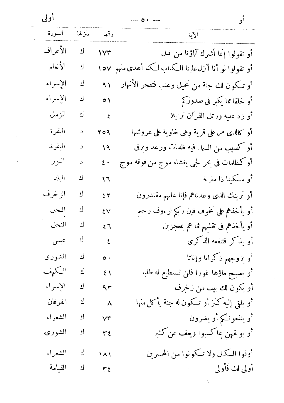 أو تقولوا إنما أشرك آباؤنا من قبل 173 ك الأعراف أو تقولوا لو أنا أنزل علينا الكتاب لكنا أهدى منهم 157 ك الأنعام أو تكون لك جنة من نخيل وعنب فتفجر الأنهار 91 ك الإسراء أو خلقا مما يكبر في صدوركم 51 ك الإسراء أو زد عليه ورتل القرآن ترتيلا 4 ك المزمل أو كالذي مر على قرية وهي خاوية على عروشها 259 د البقرة أو كصيب من السماء فيه رعد وبرق 19 د البقرة أو كظلمات في بحر لجي يغشاه موج من فوقه موج 40 د النور أو مسكينا ذا متربة 16 ك البلد