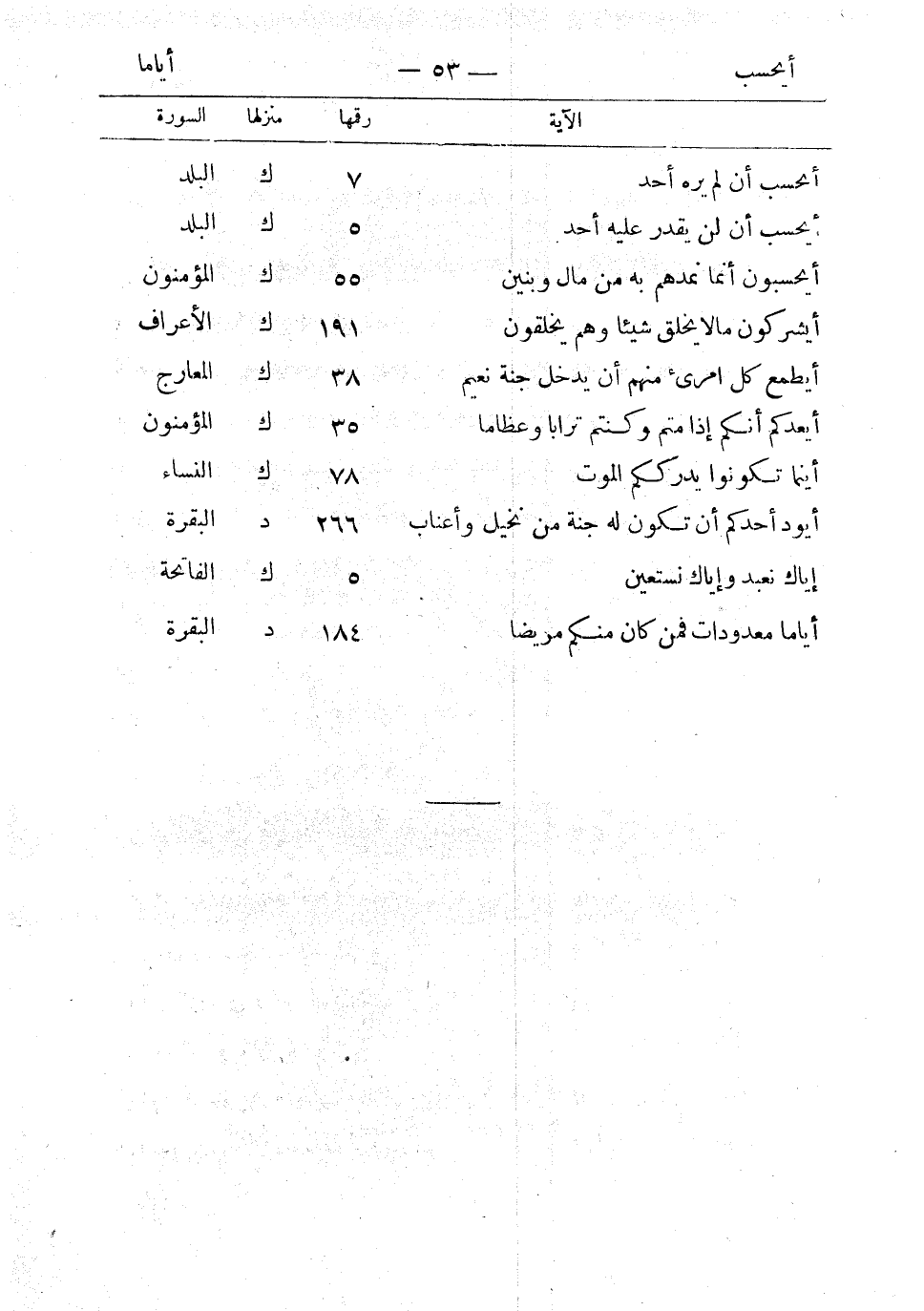 أيحسب أن لم يره أحد 7 ك البلد أيحسب أن لن يقدر عليه أحد 5 ك البلد أيحسبون أنما نمدهم به من مال وبنين 55 ك المؤمنون أيشركون ما لا يخلق شيئا وهم يخلقون 191 ك الأعراف إيلافهم رحلة الشتاء والصيف 2 ك قريش أيطمع كل امرئ منهم أن يدخل جنة نعيم 38 ك المعارج أيعدكم أنكم إذا متم وكنتم ترابا وعظاما 35 ك المؤمنون أينما تكونوا يدرككم الموت 78 ك النساء أيود أحدكم أن تكون له جنة من نخيل وأعناب 266 د البقرة