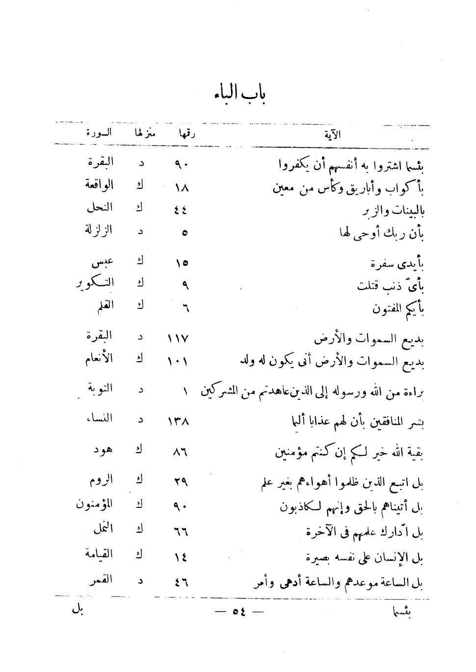 باب الباء بئسما اشتروا به أنفسهم أن يكفروا 90 د البقرة بأكواب وأباريق وكأس من معين 18 ك الواقعة بالبينات والزبر 44 ك النحل بأن ربك أوحى لها 5 د الزلزلة بأيدي سفرة 15 ك عبس بأي ذنب قتلت 9 ك التكوير بأيكم المفتون 6 ك القلم بديع السموات والأرض 117 د البقرة بديع السموات والأرض أنى يكون له ولد 101 ك الأنعام براءة من الله ورسوله إلى الذين عاهدتم من المشركين 1 د التوبة بشيرا ونذيرا فأعرض أكثرهم 4 ك فصلت بشر المنافقين بأن عذابا أليما 138 د النساء بقية الله خير لكم إن كنتم مؤمنين 86 ك هود بل اتبع الذين ظلموا أهواءهم بغير علم 29 ك الروم بل أتيناهم بالحق وإنهم لكاذبون 90 ك المؤمنون بل ادارك علمهم في الآخرة 66 ك النمل بل الإنسان على نفسه بصيرة 14 ك القيامة بل الساعة موعدهم والساعة أدهى وأمر 46 د القمر