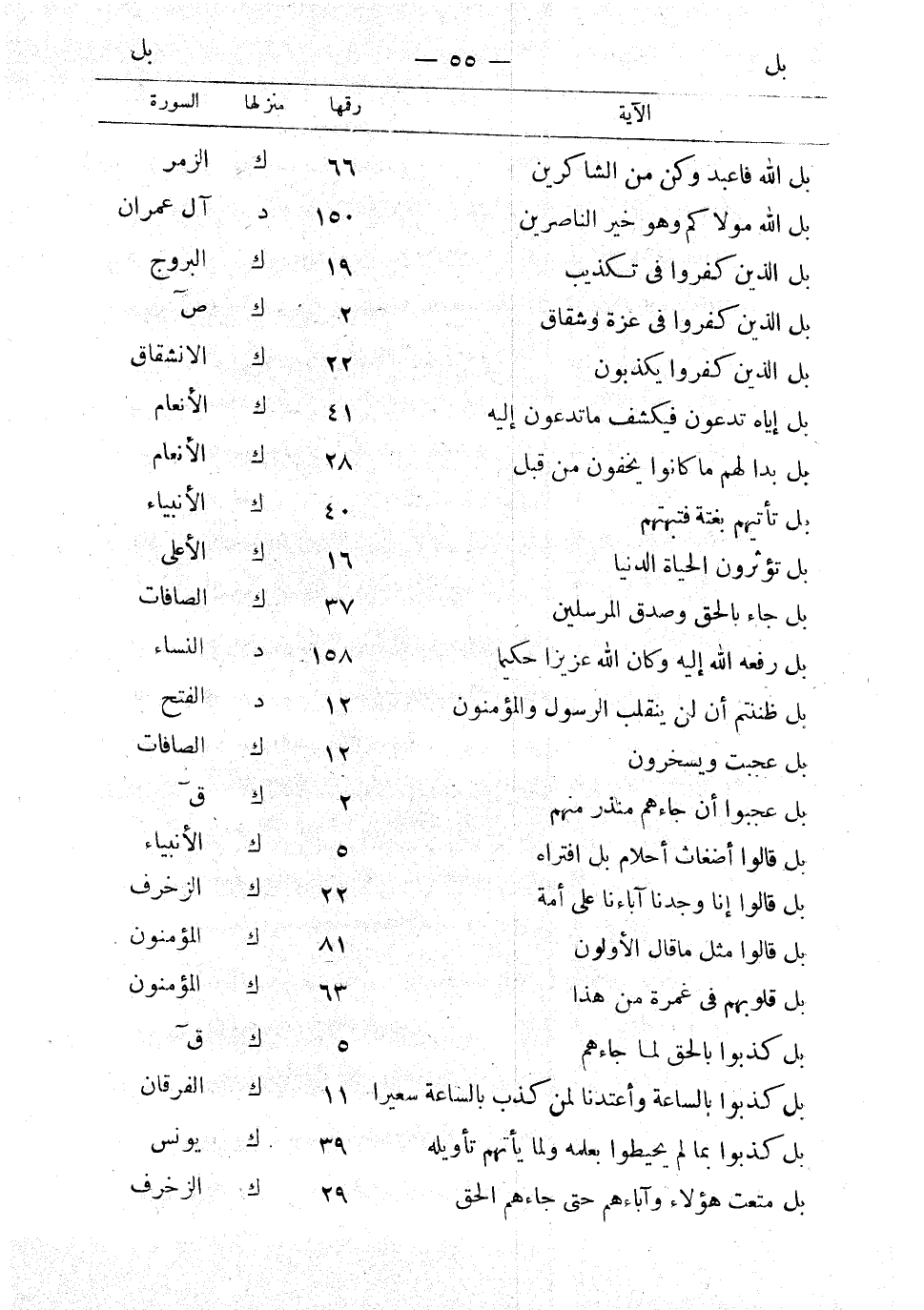 بل الله فاعبد وكن من الشاكرين 66 ك الزمر بل الله مولاكم وهو خير الناصرين 150 د آل عمران بل الذين كفروا في تكذيب 19 ك البروج بل الذين كفروا في عزة وشقاق 2 ك ص بل الذين كفروا يكذبون 22 ك الانشقاق بل إياه تدعون فيكشف ما تدعون إليه 41 ك الأنعام بل بدا لهم ما كانوا يخفون من قبل 28 ك الأنعام بل تأتيهم بغة فتبهتهم 40 ك الأنبياء بل تؤثرون الحياة الدنيا 16 ك الأعلى بل جاء بالحق وصدق المرسلين 37 ك الصافات بل رفعه الله إليه وكان الله عزيزا حكيما 158 د النساء بل ظننتم أن لن ينقلب الرسول والمؤمنون 12 د الفتح بل عجبت ويسخرون 12 ك الصافات بل عجبوا أن جاءمنذر منهم 2 ك ق بل قالوا أضغاث أحلام بل افتراه 5 ك الأنبياء بل قالوا إنا وجدنا آباءنا على أمة 22 ك الزخرف بل قالوا مثل ما قال الأولون 81 ك المؤمنون بل قلوبهم في غمرة من هذا 63 ك المؤمنون بل كذبوا بالحق لما جاءهم 5 ك ق بل كذبوا بالساعة وأعتدنا لمن كذب بالساعة سعيرا 11 ك الفرقان بل كذبوا بما لم يحيطوا بعلمه ولما يأتهم تأويله 39 ك يونس