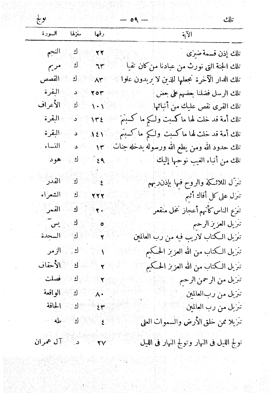 تلك إذن قسمة ضيزى 22 ك النجم تلك الجنة التي نورث من عبادنا من كان تقيا 63 ك مريم تلك الدار الآخرة نجعلها للذين لا يريدون علوا 83 ك القصص تلك الرسل فضلنا بعضهم على بعض 253 د البقرة تلك القرى نقص عليك من أنبائها 101 ك الأعراف تلك أمة قد خلت لها ما كسبت ولكم ما كسبتم 134 د البقرة تلك أمة قد خلت لها ما كسبت ولكم ما كسبتم 141 د البقرة تلك حدود الله ومن يطع الله ورسوله يدخله جنات 13 د النساء تلك من أنباء الغيب نوحيها إليك 49 ك هود تتنزل الملائكة والروح فيها بإذن ربهم 4 ك القدر تتنزل على كل أفاك أثيم 222 ك الشعراء تنزع الناس كأنهم أعجاز نخل منقعر 20 ك القمر تنزيل العزيز الرحيم 5 ك يس تنزيل الكتاب لا ريب فيه من رب العالمين 2 ك السجدة تنزيل الكتاب من الله العزيز الحكيم 1 ك الزمر تنزيل الكتاب من الله العزيز الحكيم 2 ك الأحقاف تنزيل الكتاب من الله العزيز الحكيم 2 ك الجاثية تنزيل الكتاب من الله العزيز العليم 2 ك غافر تنزيل من الرحمن الرحيم 2 ك فصلت تنزيل من رب العالمين 80 ك الواقعة تنزيل من رب العالمين 43 ك الحاقة