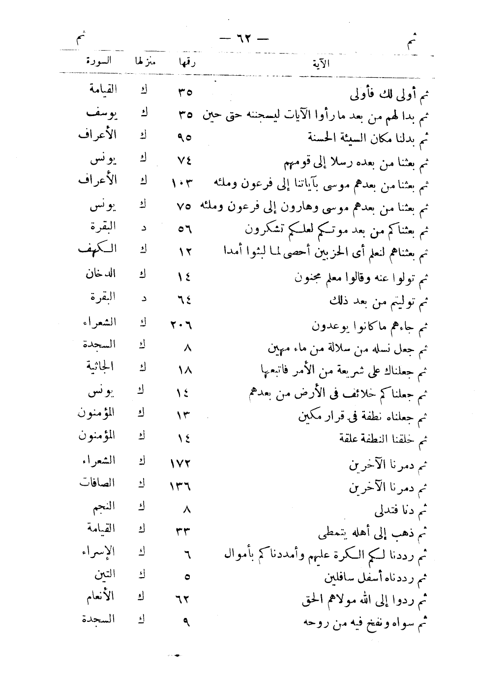 ثم أولى لك فأولى 35 ك القيامة ثم بدا لهم من بعد ما رأوا الآيات ليسجننه حتى حين 35 ك يوسف ثم بدلنا مكان السيئة الحسنة 95 ك الأعراف ثم بعثنا من بعده رسلا إلى قومهم 74 ك يونس ثم بعثنا من بعهدهم موسى بآياتنا إلى فرعون ومثله 103 ك الأعراف ثم بعثنا من بعدهم موسى وهارون إلى فرعون ومثله 75 ك يونس ثم بعثناكم من بعد موتكم لعلكم تشكرون 56 د البقرة ثم بعثناهم لنعلم أي الحزبين أحصى لما لبثوا أمدا 12 ك الكهف ثم تولوا عنه وقالوا معلم مجنون 14 ك الدخان ثم توليتم من بعد ذلك 64 د البقرة ثم جاءهم ما كانوا يوعدون 206 ك الشعراء ثم جعل نسله من سلالة من ماء مهين 8 ك السجدة ثم جعلناك على شريعة من الأمر فاتبعها 18 ك الجاثية ثم جعلناكم خلائف في الأرض من بعدهم 14 ك يونس ثم جعلناه نطفة في قرار مكين 13 ك المؤمنون ثم خلقنا النطفة علقة 14 ك المؤمنون