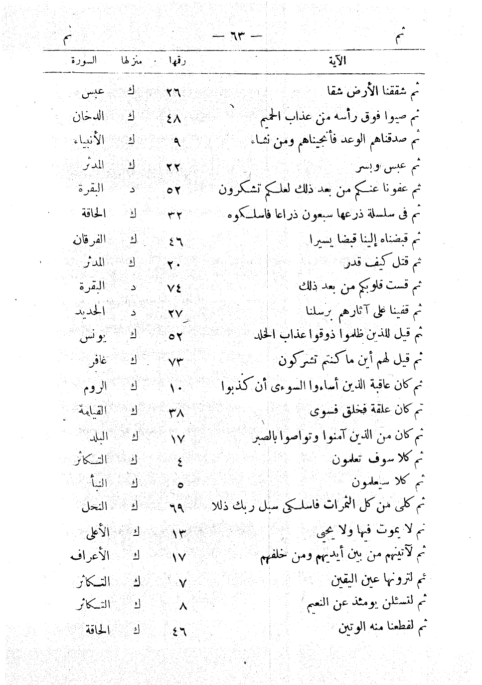 ثم شققنا الأرض شقا 26 ك عبس ثم صبوا فوق رأسه من عذاب الحميم 48 ك الدخان ثم صدقناهم الوعد فأنجيناهم ومن نشاء 9 ك الأنبياء ثم عبس وبسر 22 ك المدثر ثم عفونا عنكم من بعد ذلك لعلكم تشكرون 52 د البقرة ثم في سلسلة ذرعها سبعون ذراعا فاسلكوه 32 ك الحاقة ثم قبضناه إلينا قبضا يسيرا 46 ك الفرقان ثم قتل كيف قدر 20 ك المدثر ثم قست قلوبكم من بعد ذلك 74 د البقرة ثم قفينا على آثارهم برسلنا 27 د الحديد ثم قيل للذين ظلموا ذوقوا عذاب الخلد 52 ك يونس ثم قيل لهم أين ما كنتم تشركون 73 ك غافر ثم كان عاقبة الذين أساءوا السوءى أن كذبوا 10 ك الروم